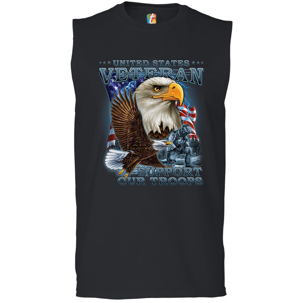 A patriotic print featuring a flying American bald eagle. There is another bald eagle covering most of the American flag in the background. There is a kneeling soldier in the front. The print says: "United States Veteran, Support our Troops". A great choice for a true patriot of the USA