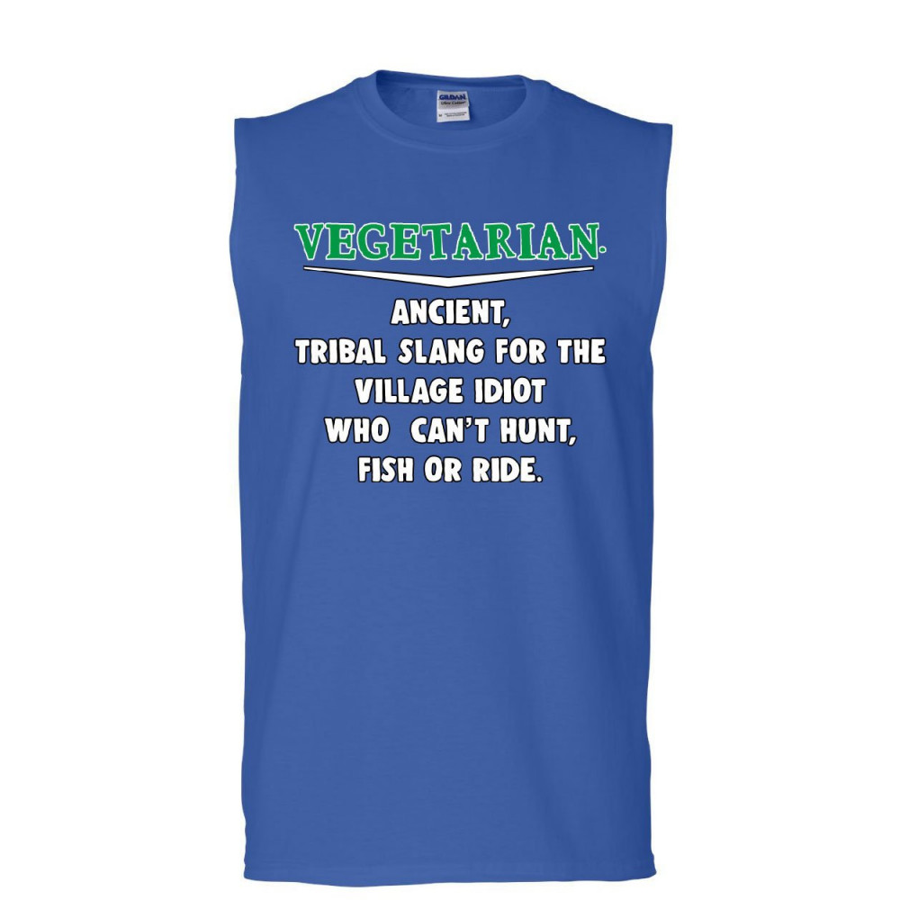 VEGETARIAN - VILLAGE IDIOT vegetarian definition muscle shirt offensive village idiot vegan meat sleeveless blue