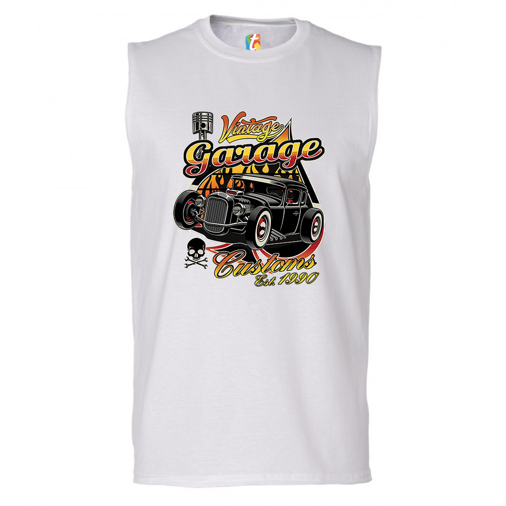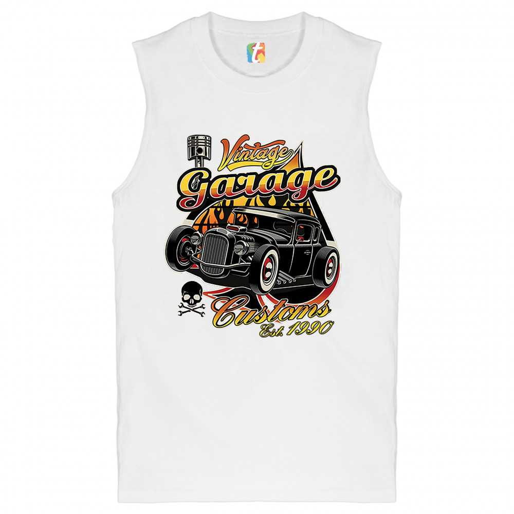 A print featuring a lowrider hot rod, a small skull with crossed wrenches instead of bones, a piston and an ace of spades in the background. The orint says: "Vintage Garage Customs Est. 1990". A great choice for a fan of customized American classic cars a