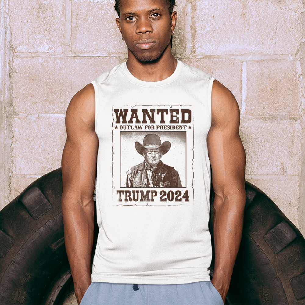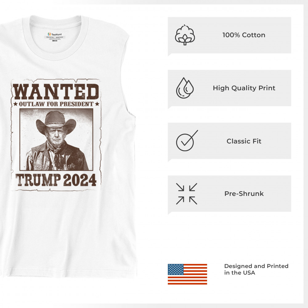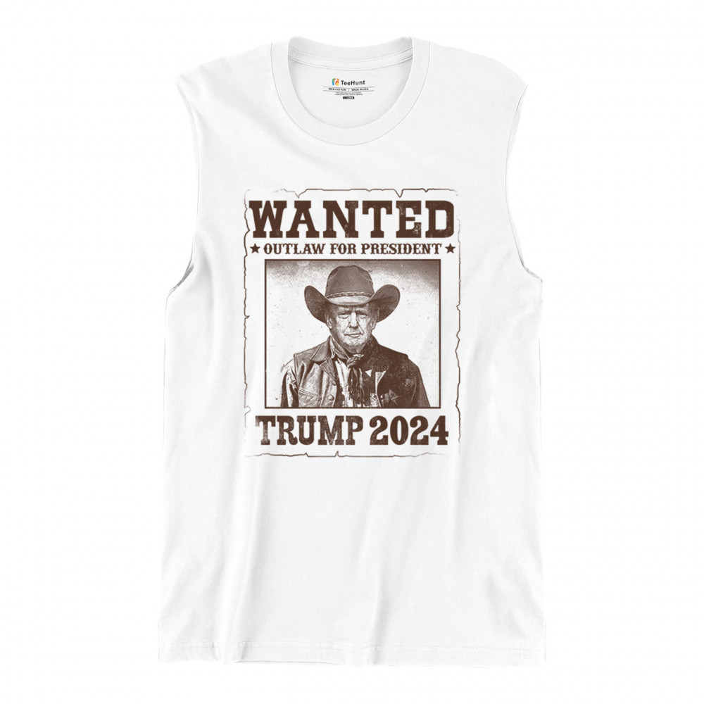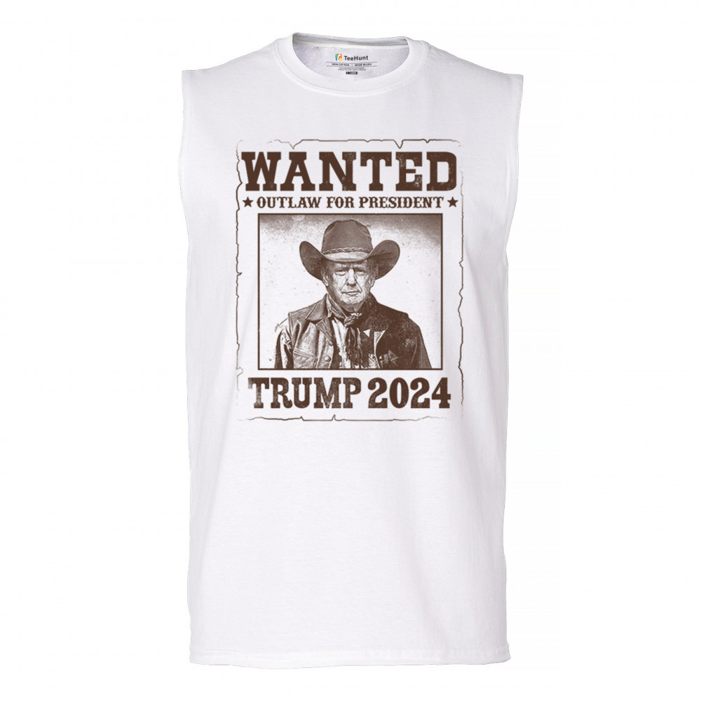 Bold "Wanted: Outlaw for President" design featuring Trump in cowboy attire, perfect for rally-goers and supporters. Express your support for the 2024 election.