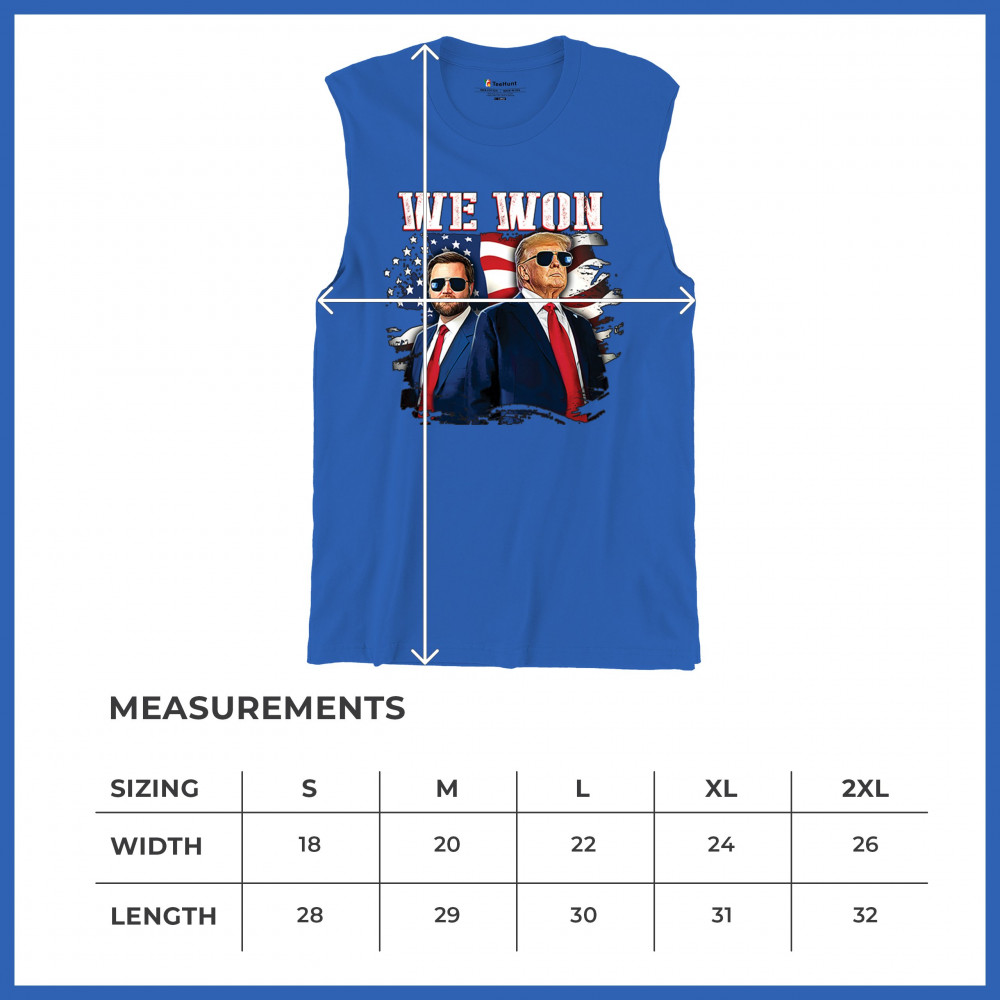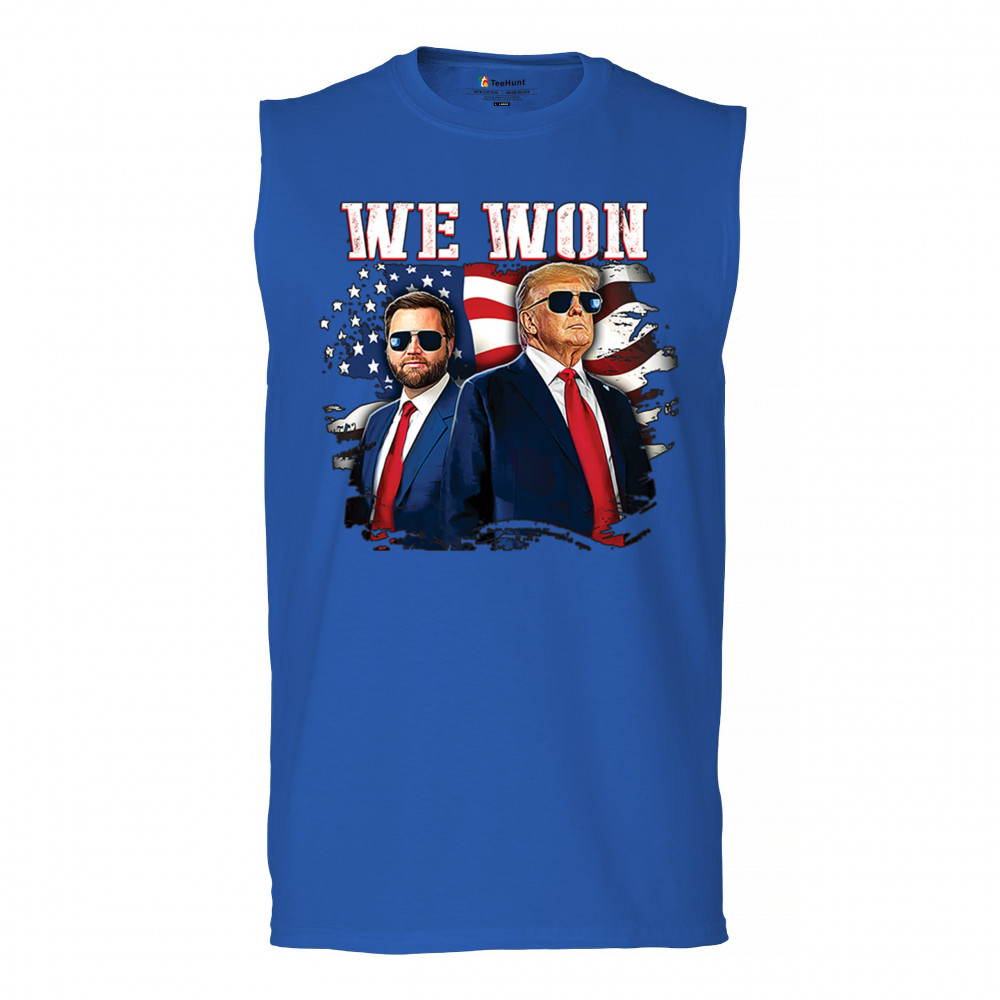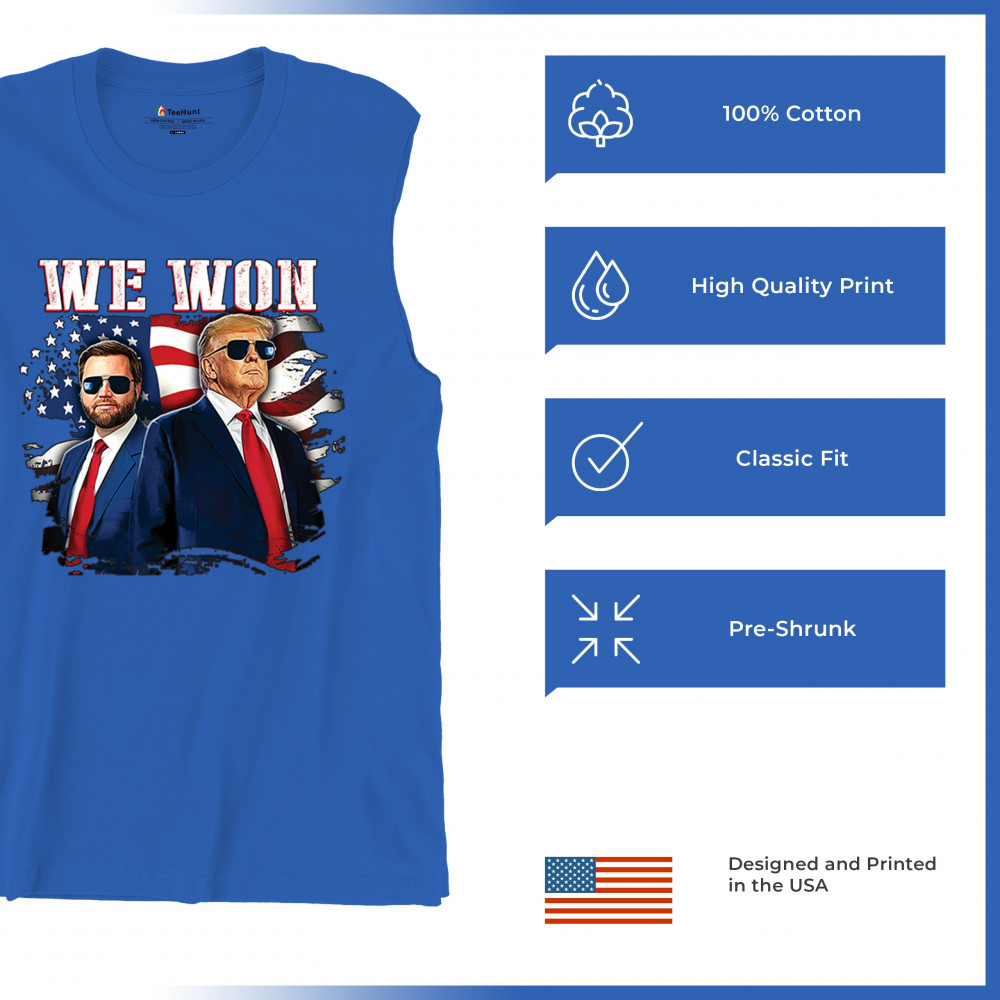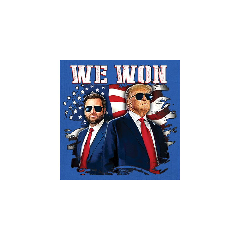 Celebrate Republican victory with this bold "We Won" design featuring Trump and patriotic flair—perfect for rallies, events, and patriotic pride.