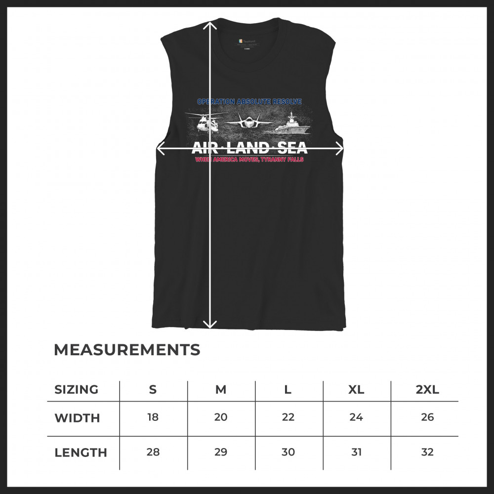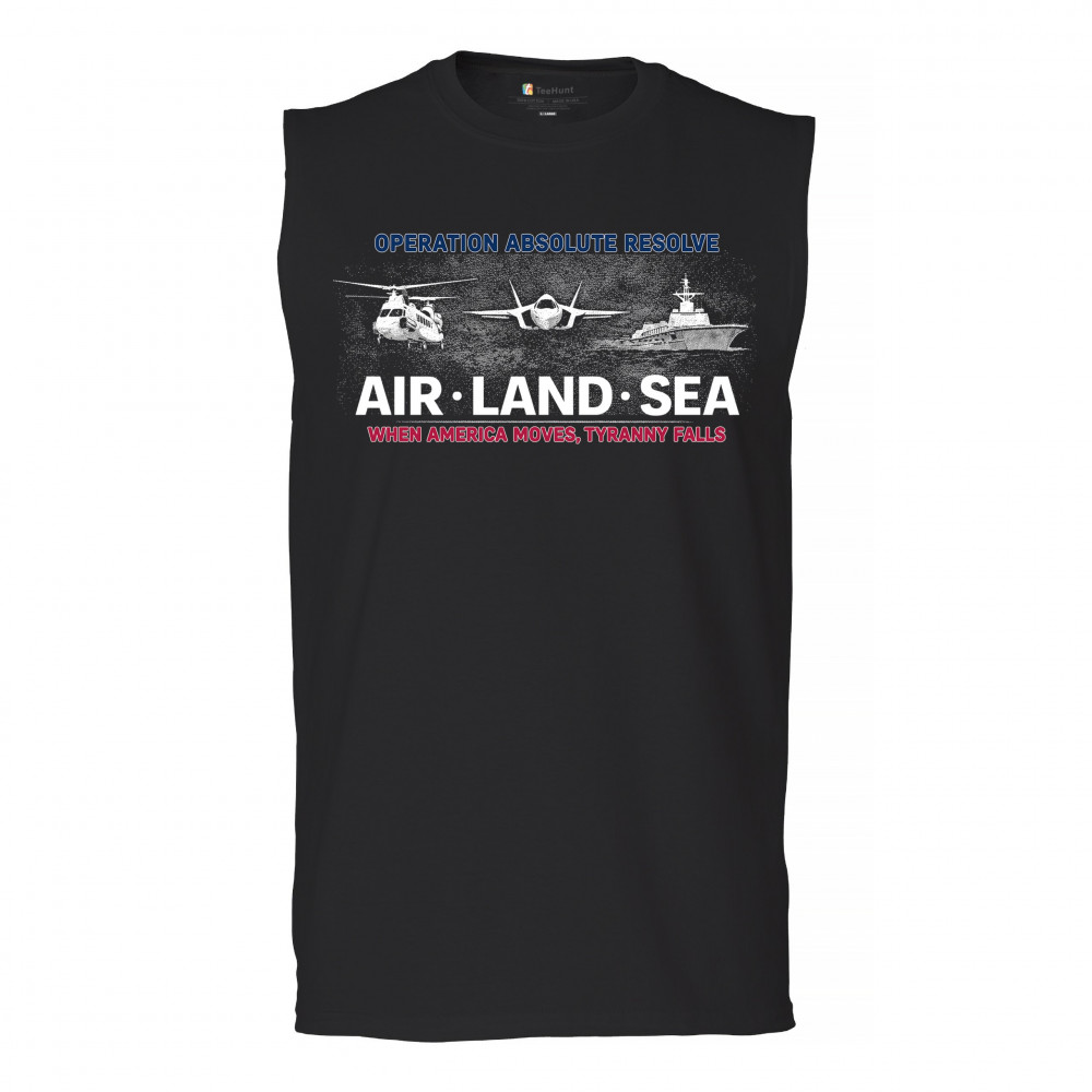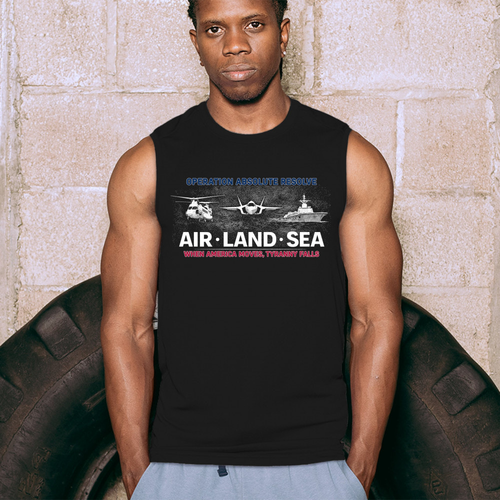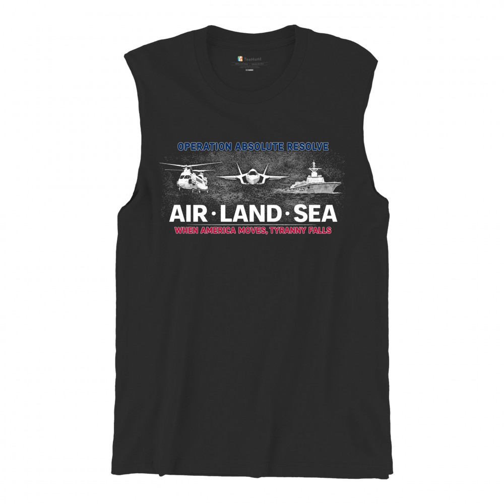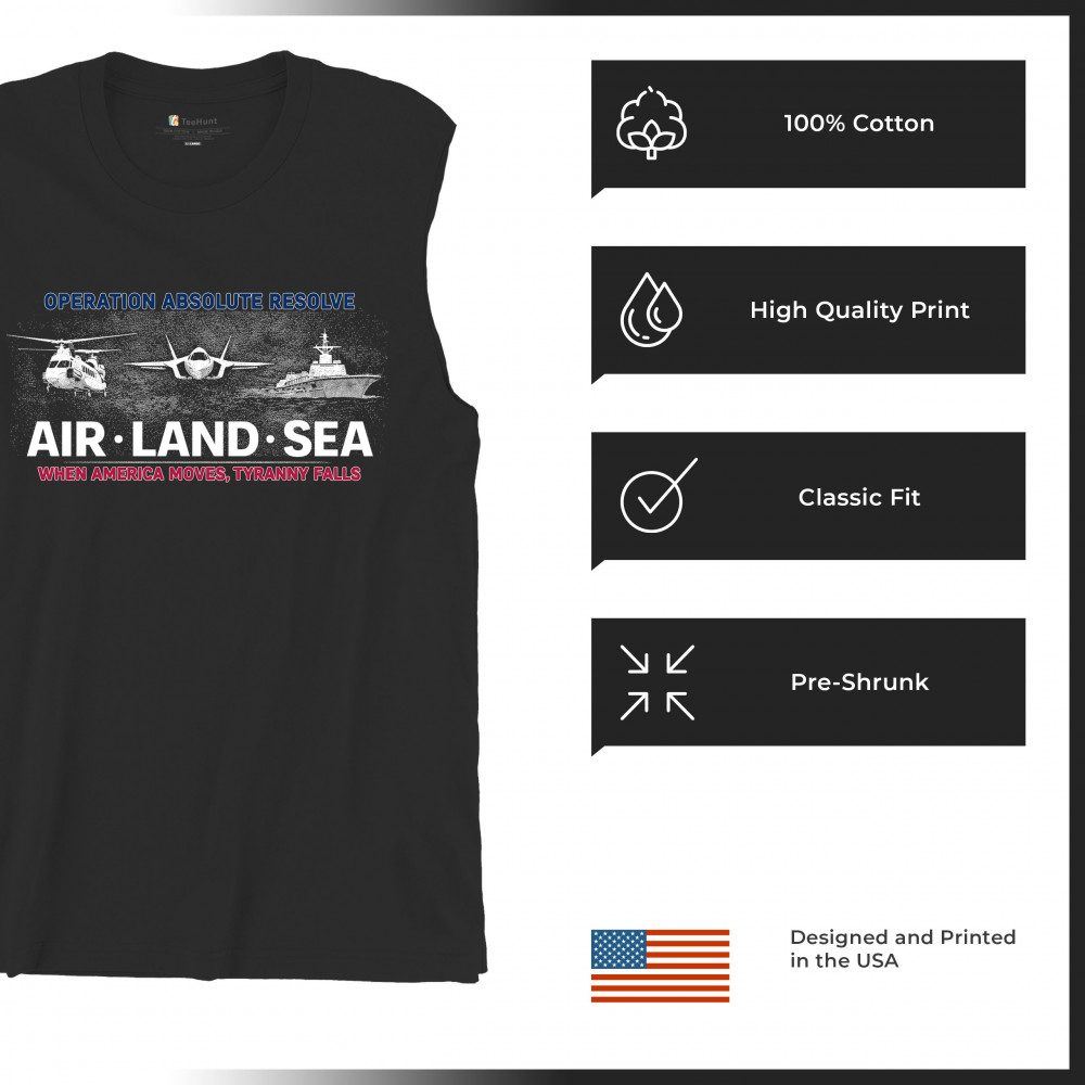 A striking patriotic graphic that combines air, land, and sea visuals to reflect coordination, resolve, and national strength. The design uses bold typography and classic military-inspired imagery without referencing specific people or conflicts. Created to feel powerful yet timeless, it works well for patriotic gatherings, heritage moments, and everyday wear.