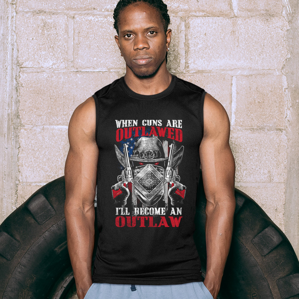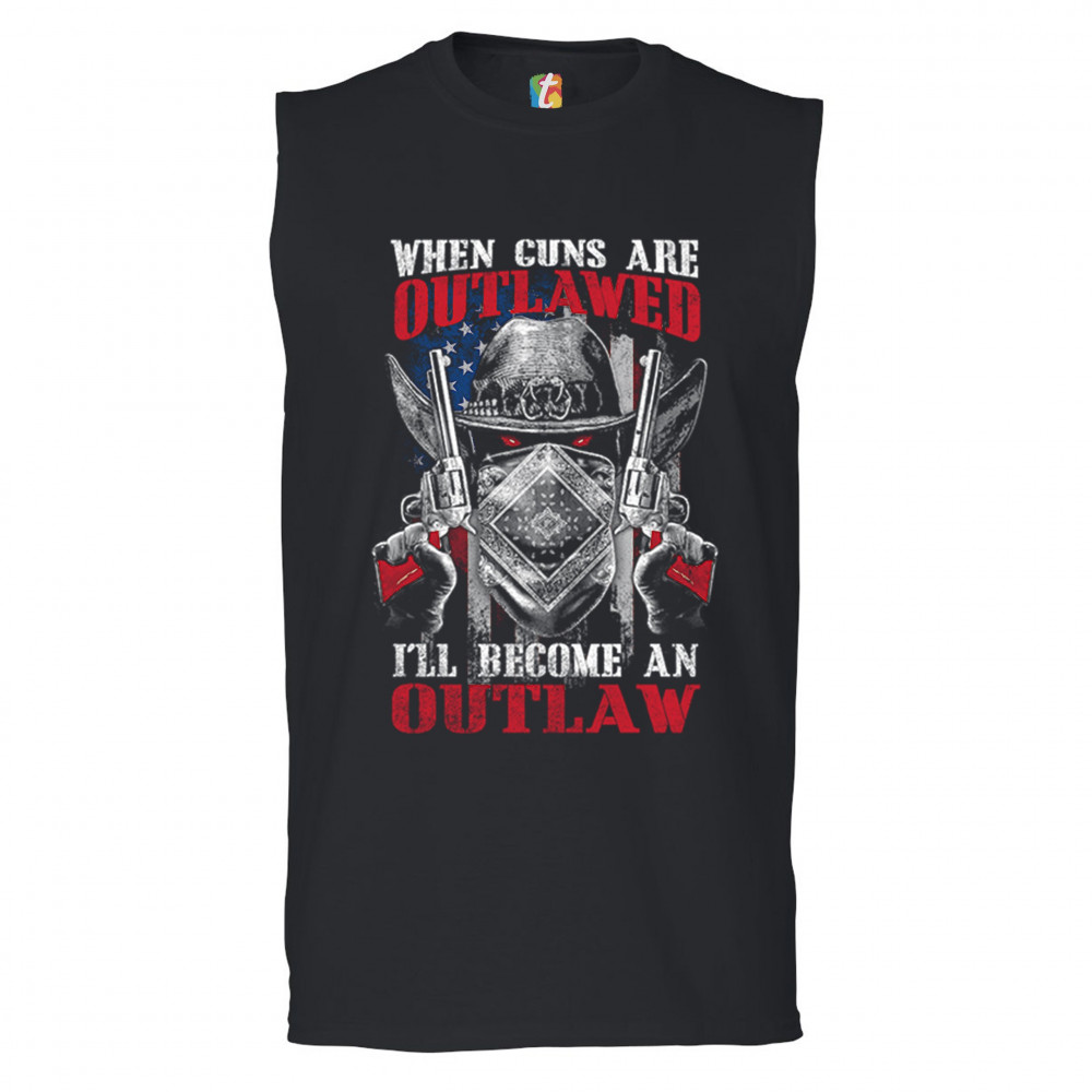 A print featuring a head wearing a cowboy hat and a bandana which covers most of the face, leaving only the red eyes to be seen. In each hand the person is holding a revoler and in the background there is the American flag. The print says: "When Guns Are