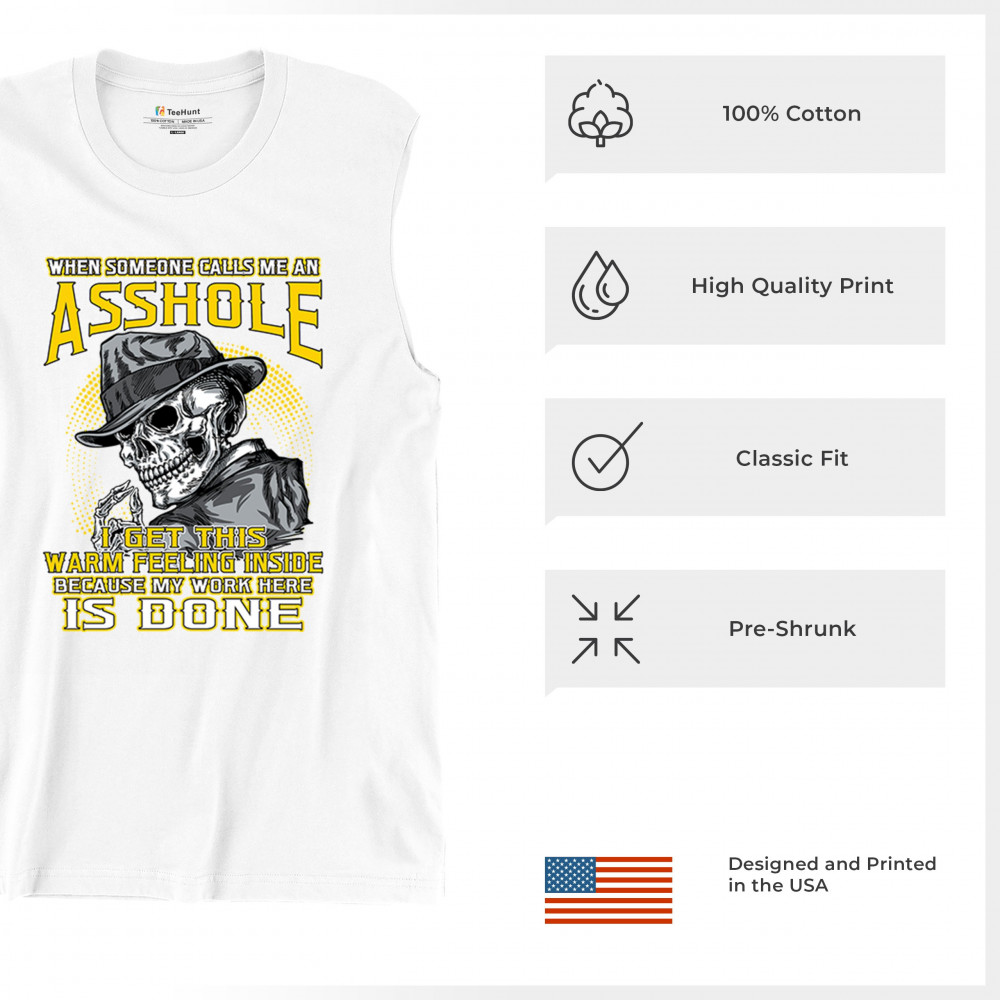 This badass design features a smirking skull in a fedora with a cigarette, backed by the line: “When someone calls me an asshole... my work here is done.†Built for dark humor fans, skull art lovers, and those who live life with sharp wit and zero regrets. Ideal for biker rallies, sarcasm nights, or anyone owning their attitude with pride.