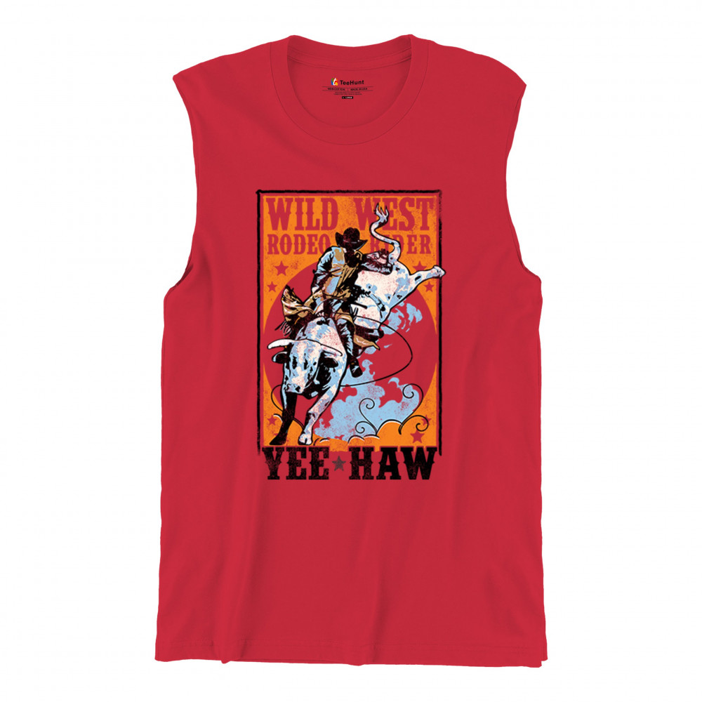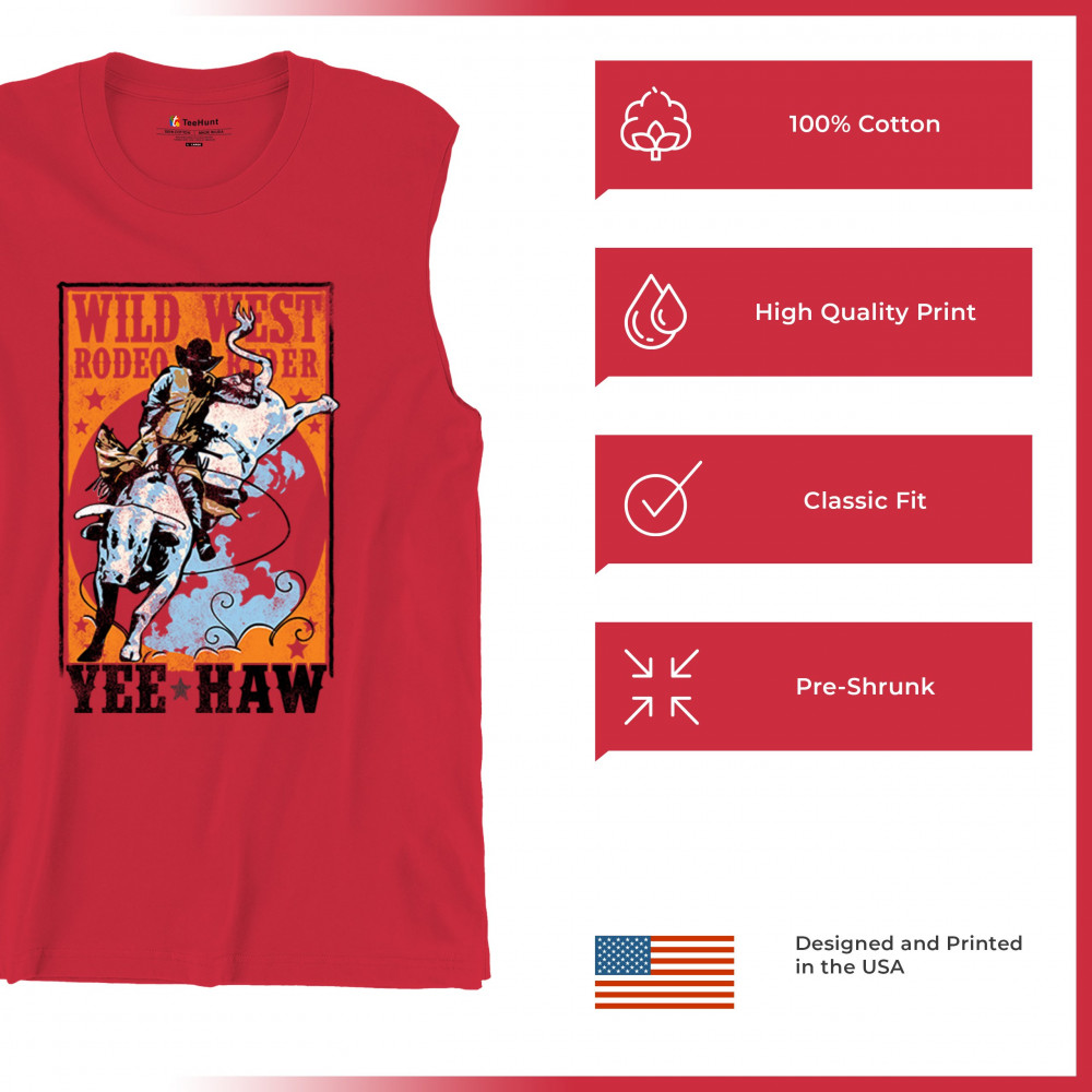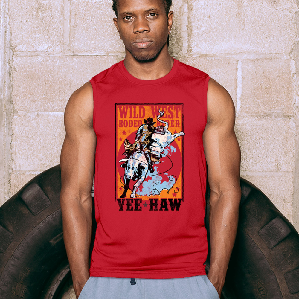 Bold cowboy bull riding design with orange backdrop, perfect for rodeo fans, western events, and country festivals.