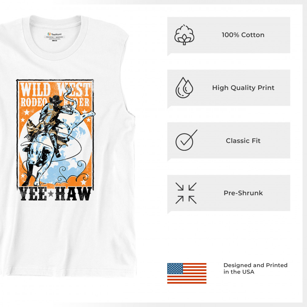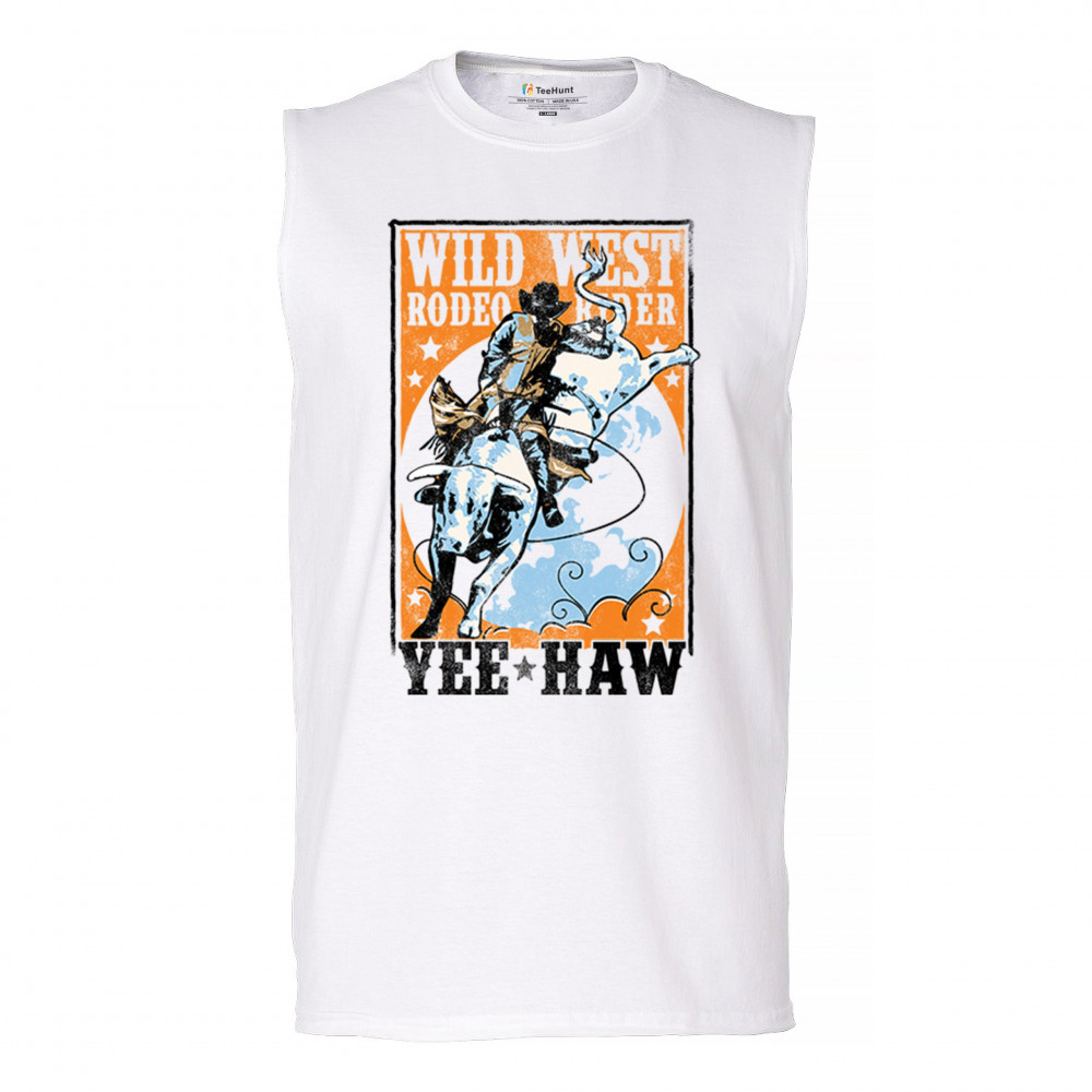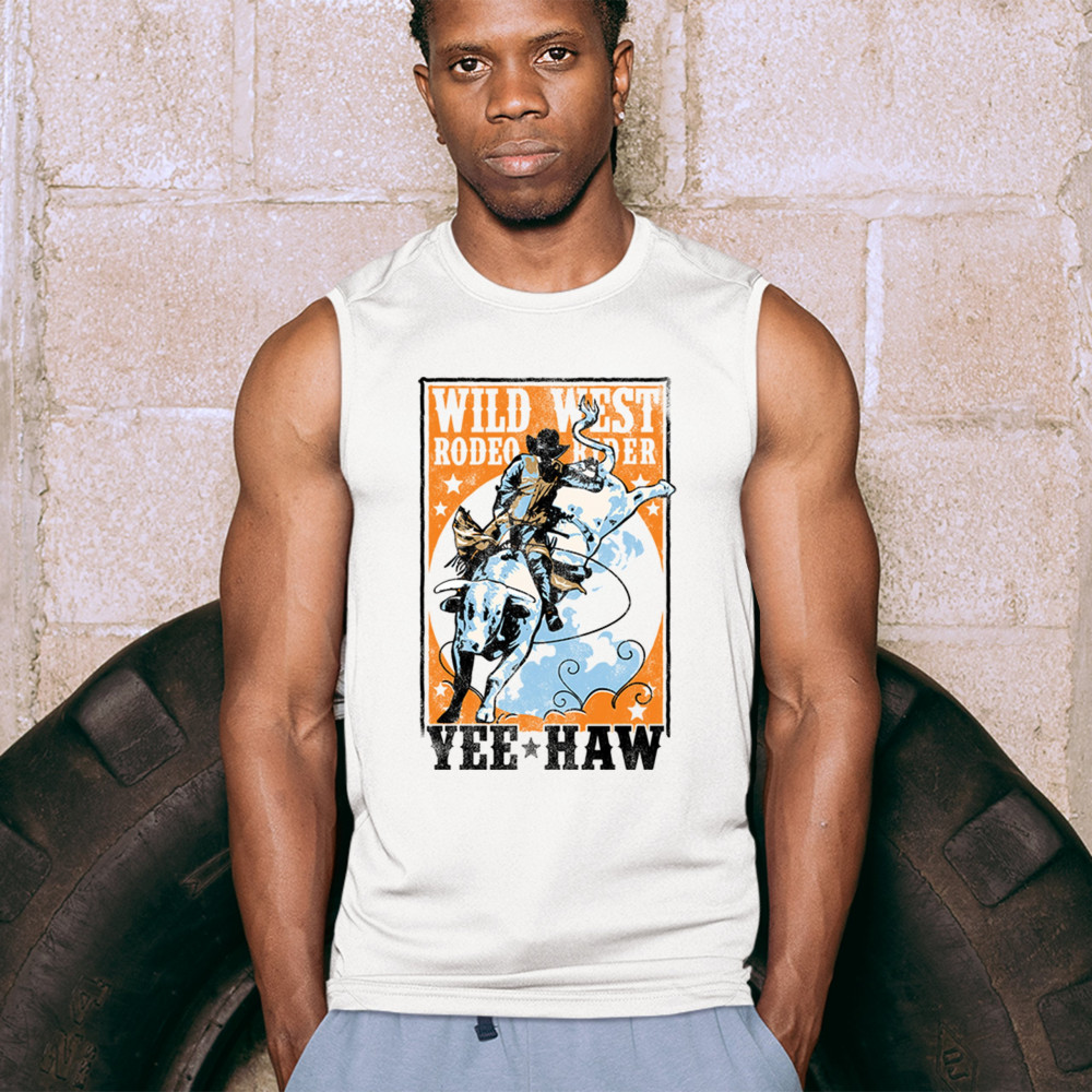 Bold cowboy bull riding design with orange backdrop, perfect for rodeo fans, western events, and country festivals.