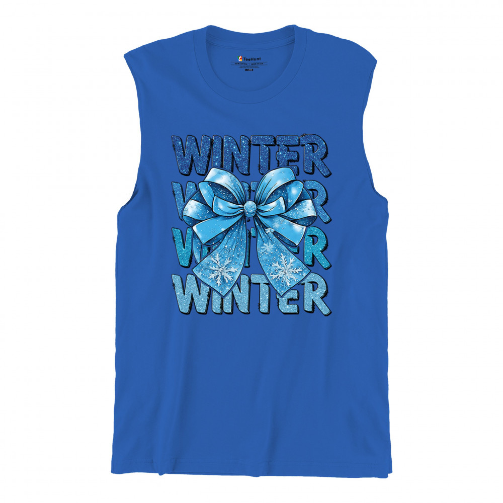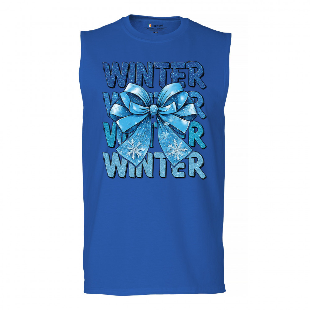 This shimmering winter bow design blends icy blue glitter style with bold repeating WINTER text for a bright seasonal statement. Snowflake accents and frosty tones create a cozy, cheerful vibe perfect for holiday outfits, gifting, or cold-weather lovers. A standout graphic that brings festive winter charm to any wardrobe and boosts seasonal search visibility.