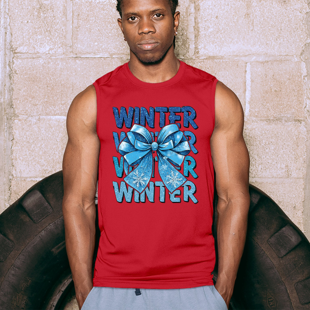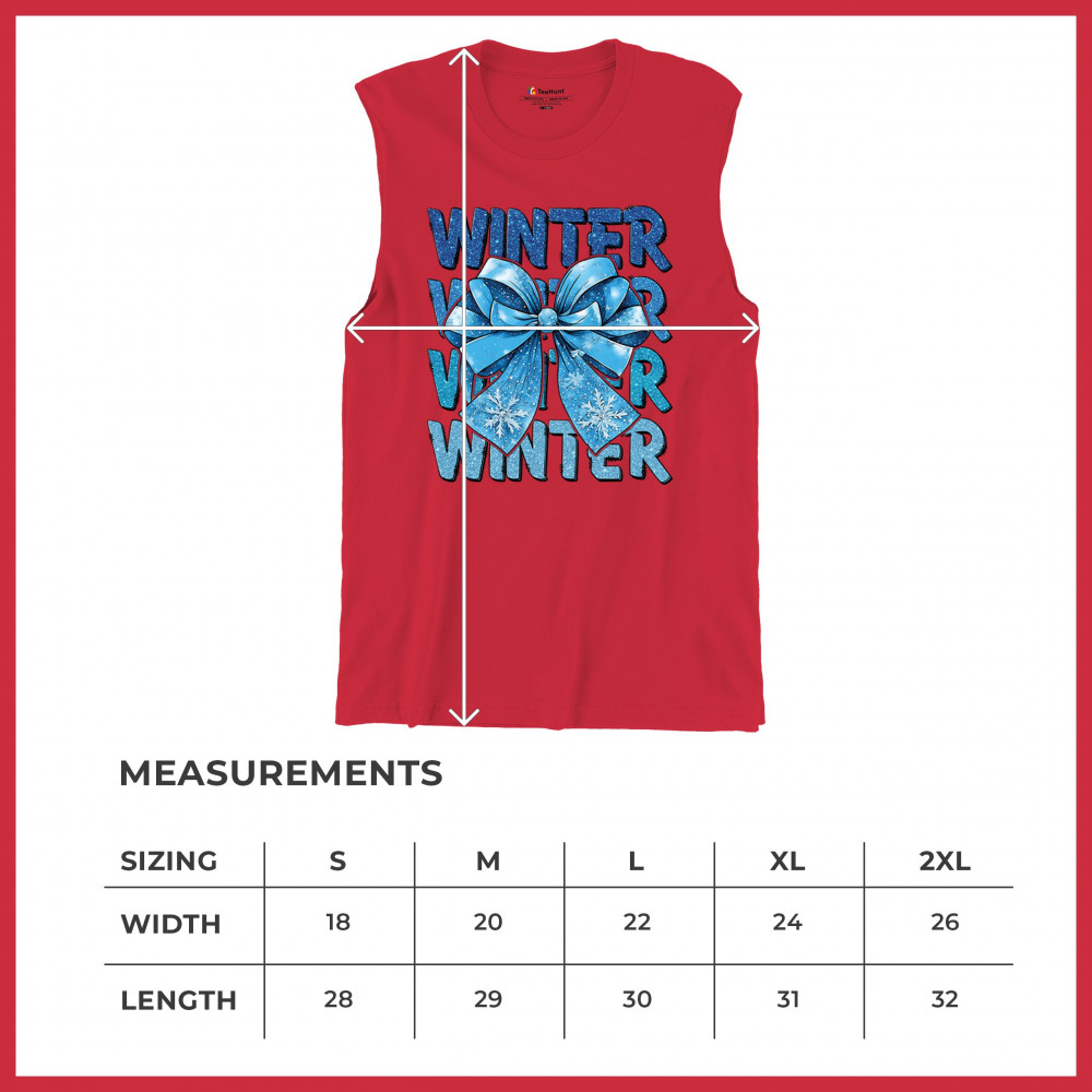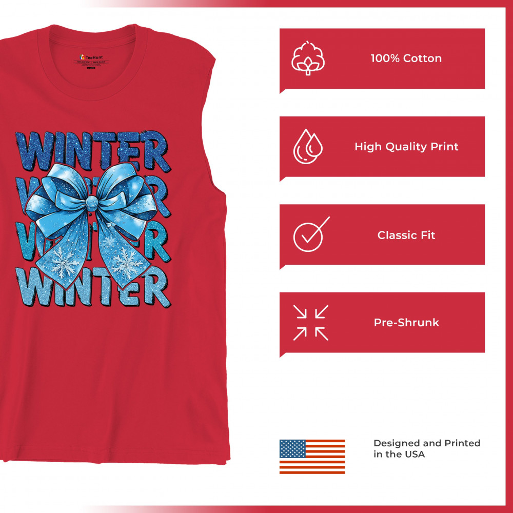 This shimmering winter bow design blends icy blue glitter style with bold repeating WINTER text for a bright seasonal statement. Snowflake accents and frosty tones create a cozy, cheerful vibe perfect for holiday outfits, gifting, or cold-weather lovers. A standout graphic that brings festive winter charm to any wardrobe and boosts seasonal search visibility.