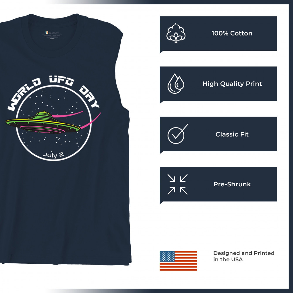 Celebrate World UFO Day on July 2nd with a captivating design featuring a sleek UFO against a starry sky. Perfect for space enthusiasts and UFO lovers.