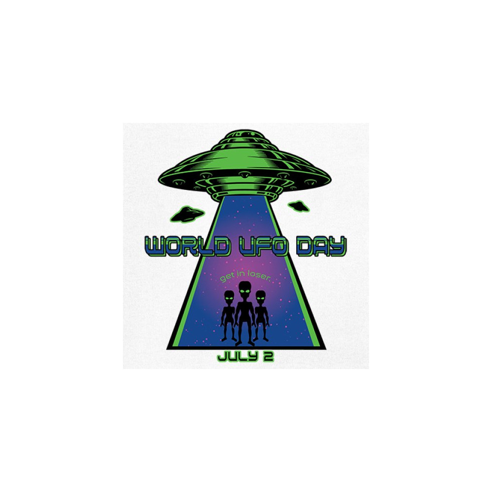 Celebrate World UFO Day with a vibrant design featuring a UFO and three playful aliens with "Get in, loser." Perfect for UFO enthusiasts and alien humor lovers.
