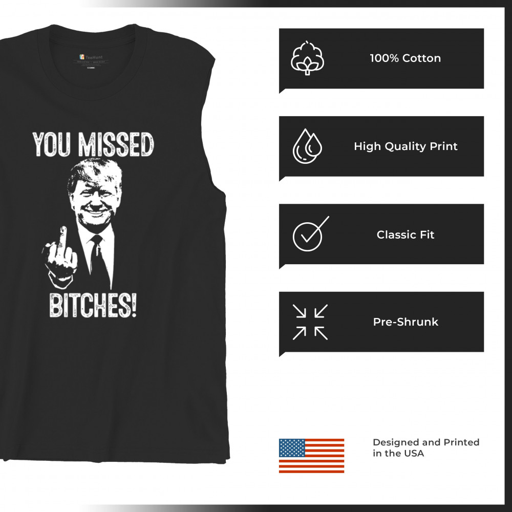 Commemorate Trump's resilience and determination with our bold "You Missed Bitches!" design. Show your support and patriotism.