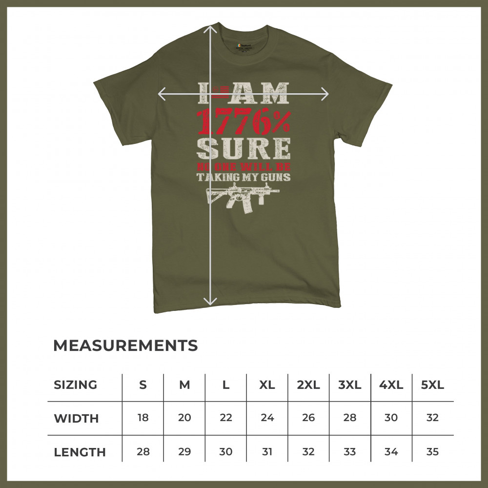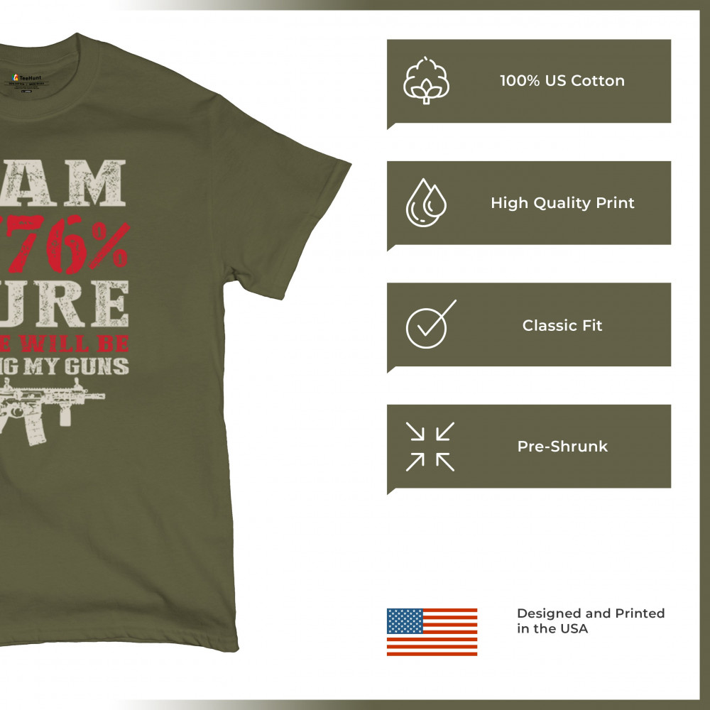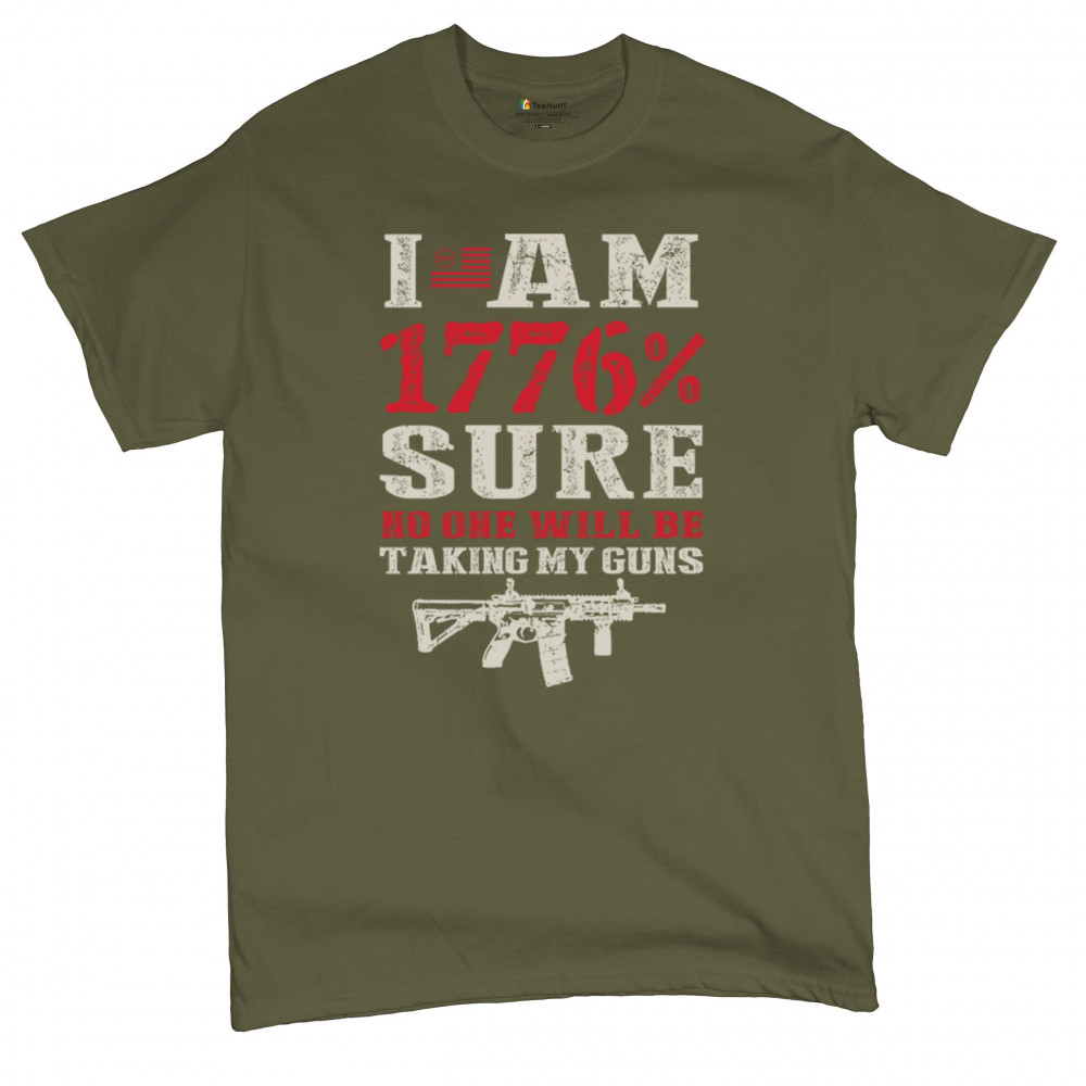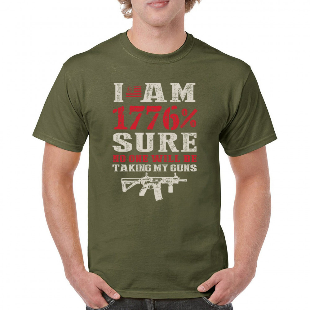 This eye-catching design shouts American pride with its 1776% certainty and pro-gun message. A distressed rifle graphic pairs with bold lettering and patriotic red, white, and blue styling. Perfect for gun owners, liberty advocates, and veterans who take their constitutional rights seriously. A true celebration of freedom and firepower.