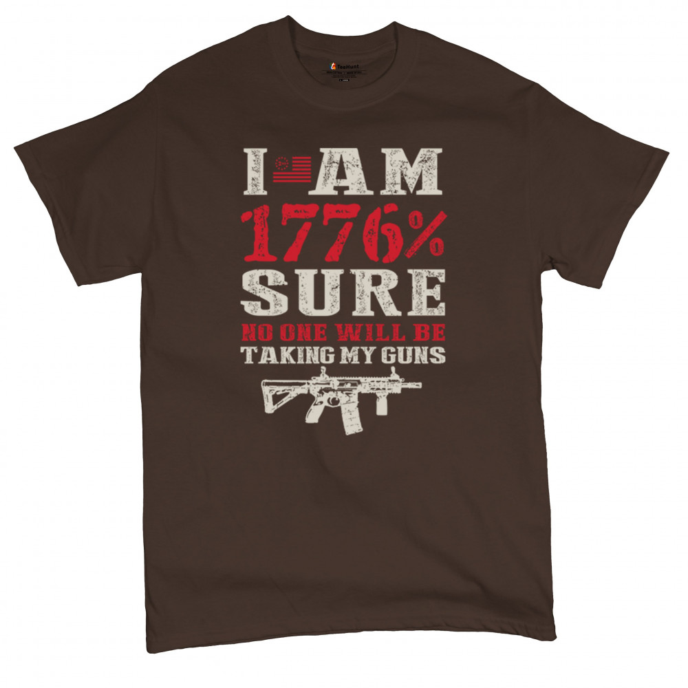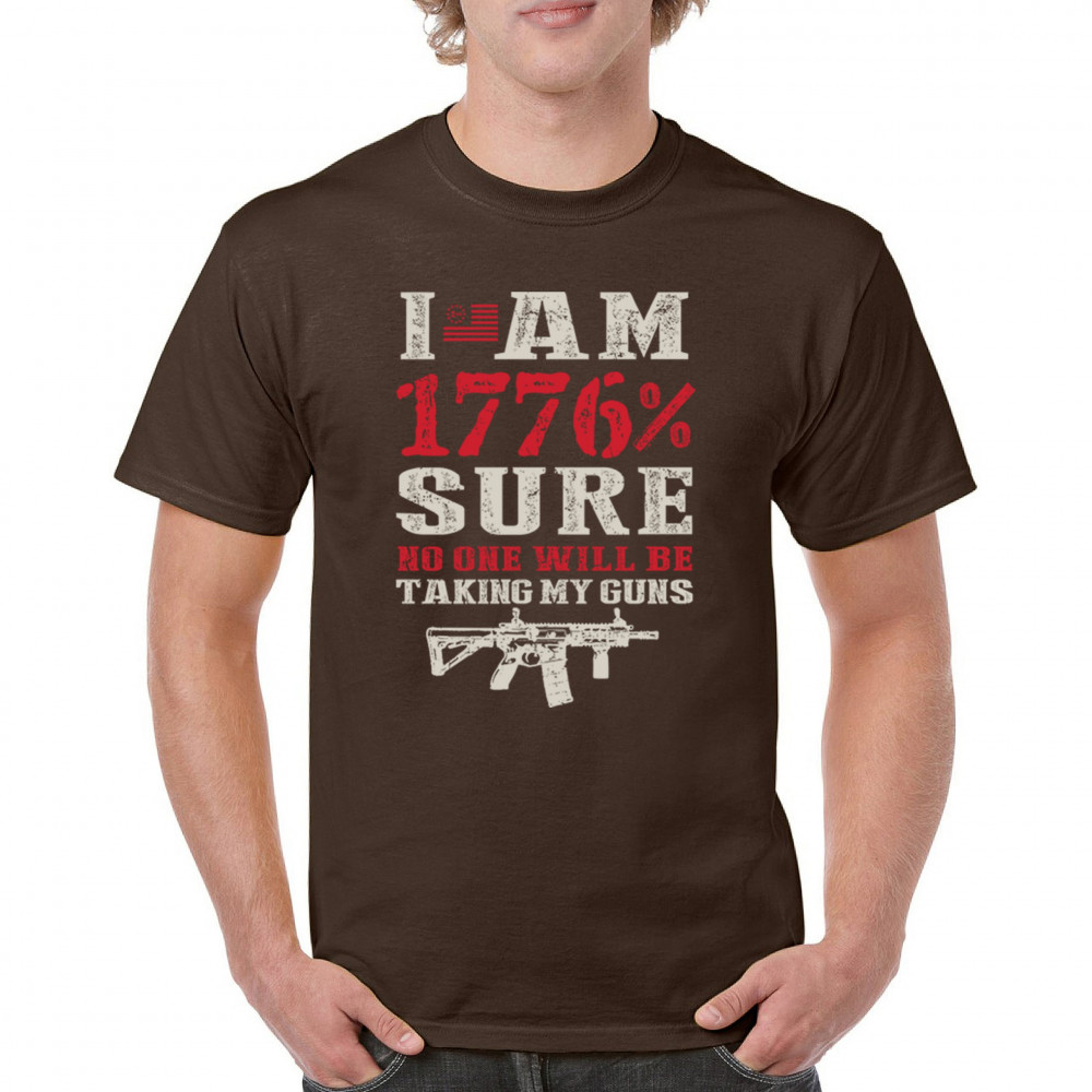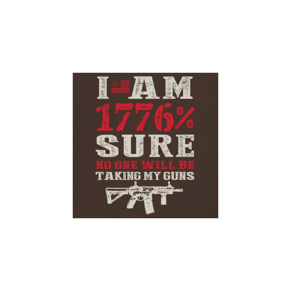 This eye-catching design shouts American pride with its 1776% certainty and pro-gun message. A distressed rifle graphic pairs with bold lettering and patriotic red, white, and blue styling. Perfect for gun owners, liberty advocates, and veterans who take their constitutional rights seriously. A true celebration of freedom and firepower.