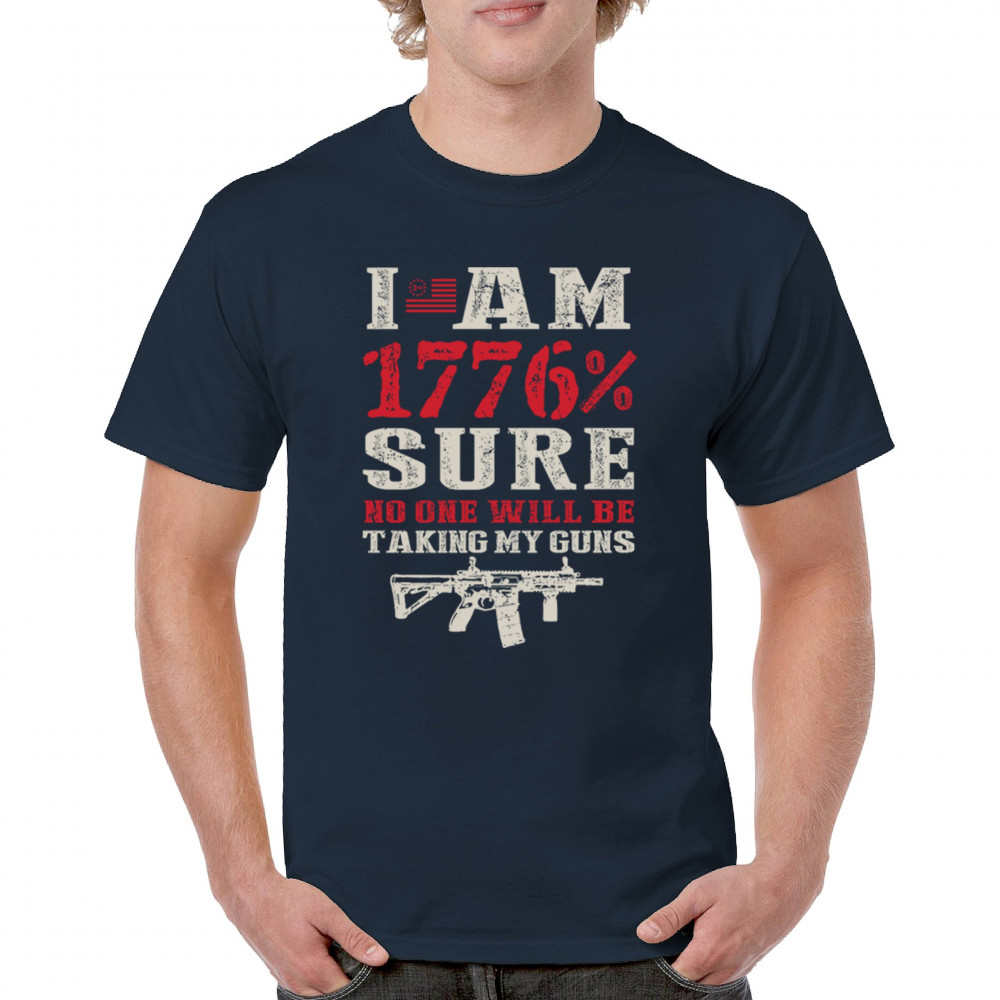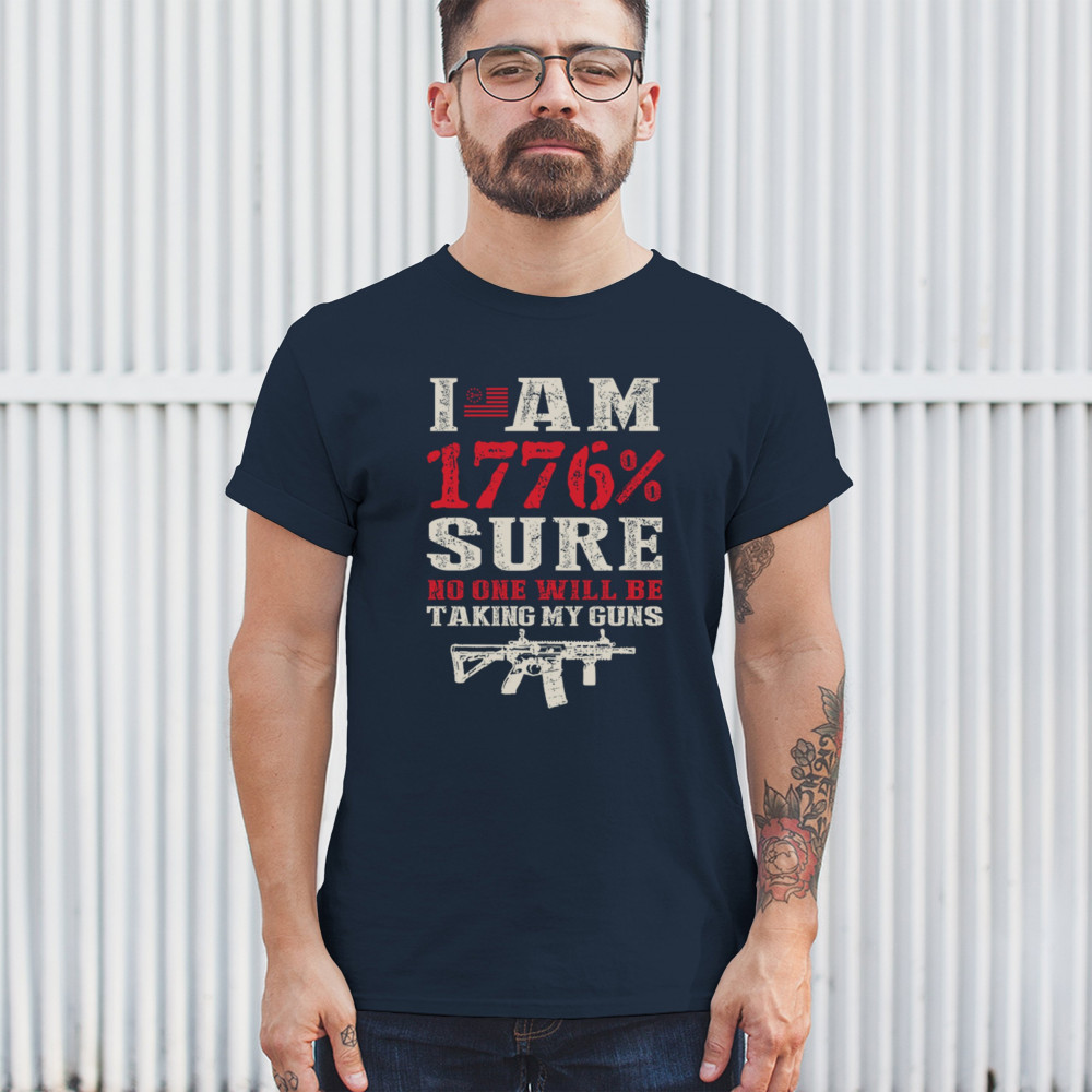 This eye-catching design shouts American pride with its 1776% certainty and pro-gun message. A distressed rifle graphic pairs with bold lettering and patriotic red, white, and blue styling. Perfect for gun owners, liberty advocates, and veterans who take their constitutional rights seriously. A true celebration of freedom and firepower.