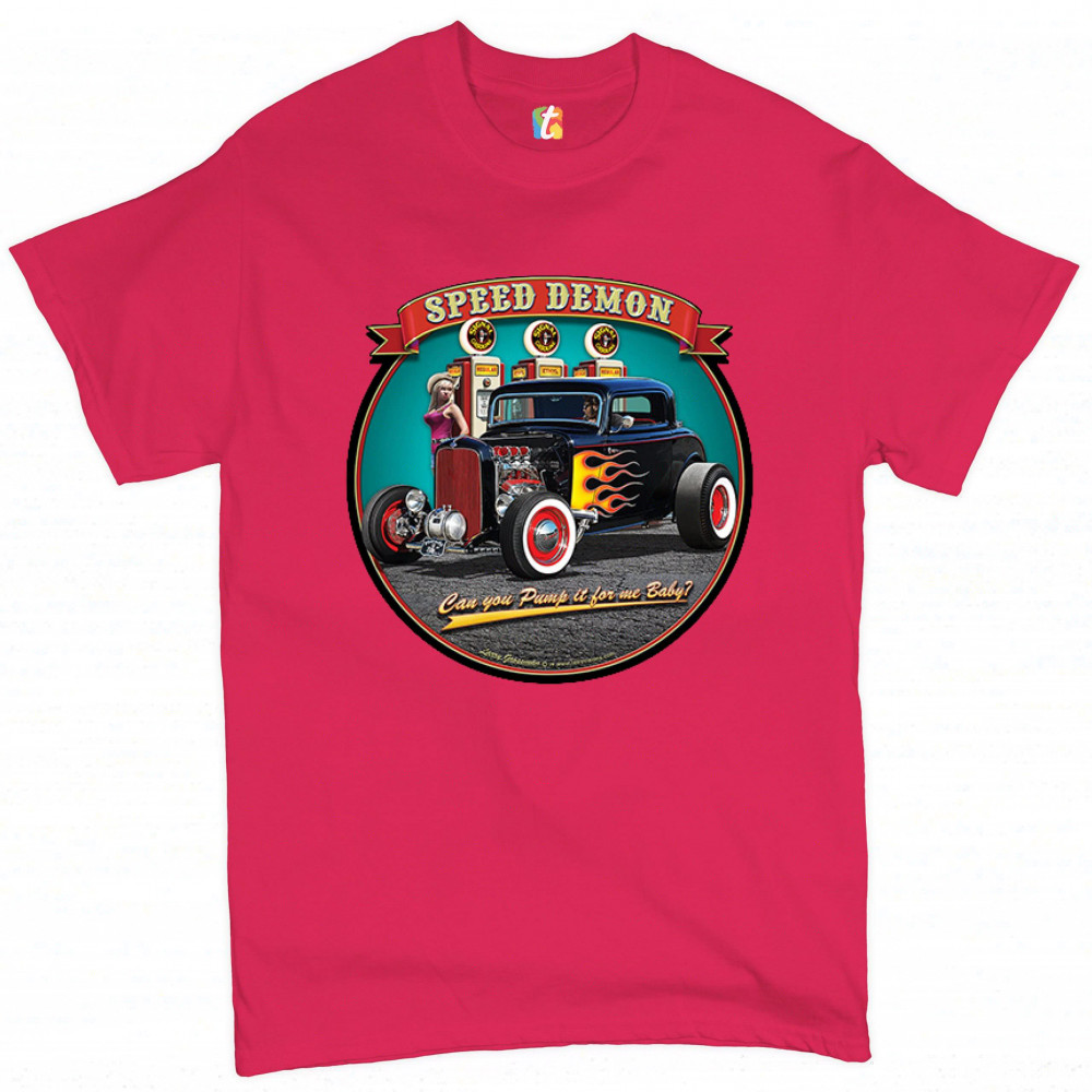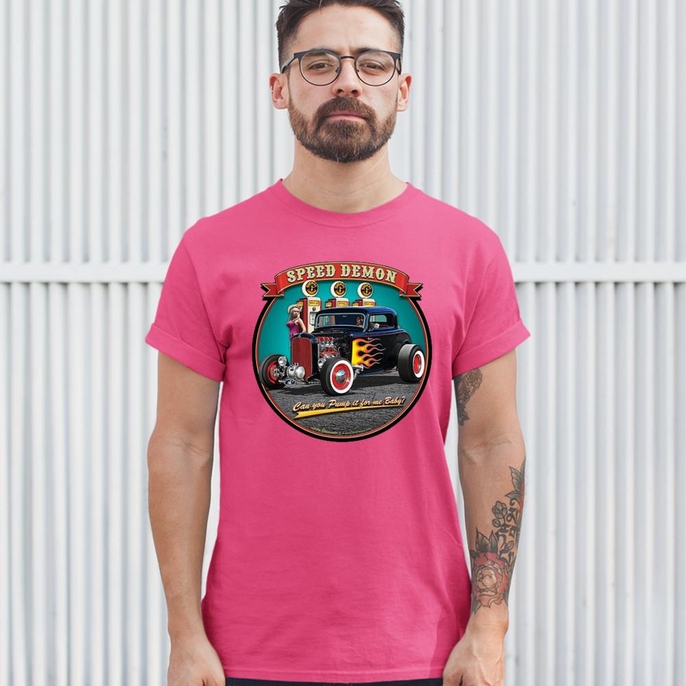 A print featuring a 1932 Ford Deuce hot rod coupe standing by a gas station. There is a cowgirl leaning on a gas pump. The print says: "speed demon" and underneath the car "Can you Pump it for me baby?". A great choice for Route 66 and hot rod fans.