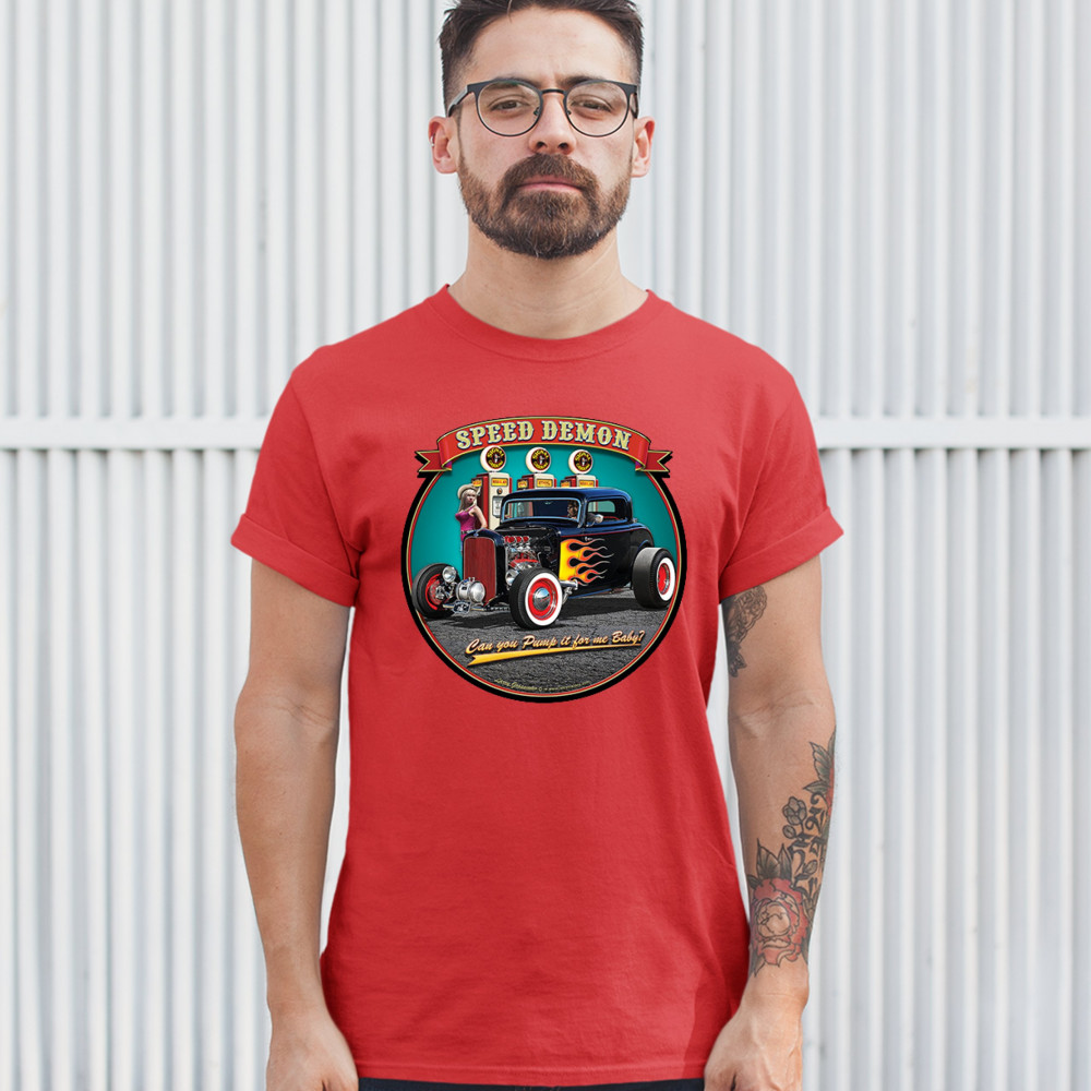 A print featuring a 1932 Ford Deuce hot rod coupe standing by a gas station. There is a cowgirl leaning on a gas pump. The print says: "speed demon" and underneath the car "Can you Pump it for me baby?". A great choice for Route 66 and hot rod fans.
