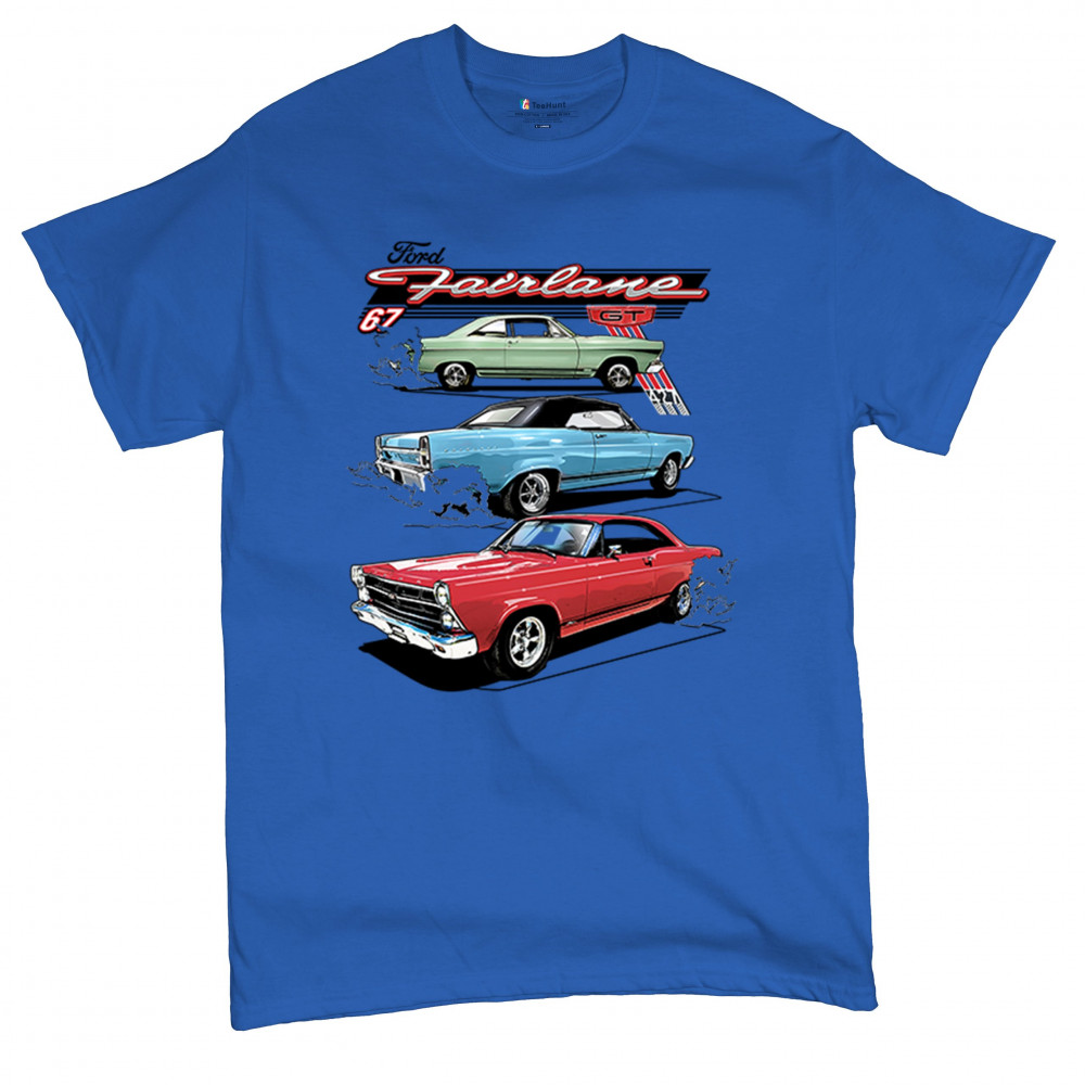 Features three 1967 Ford Fairlane GTs with retro burnout style. Great for muscle car fans, Ford collectors, car shows, and vintage meetups.