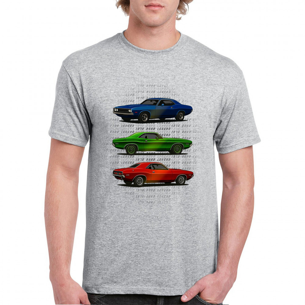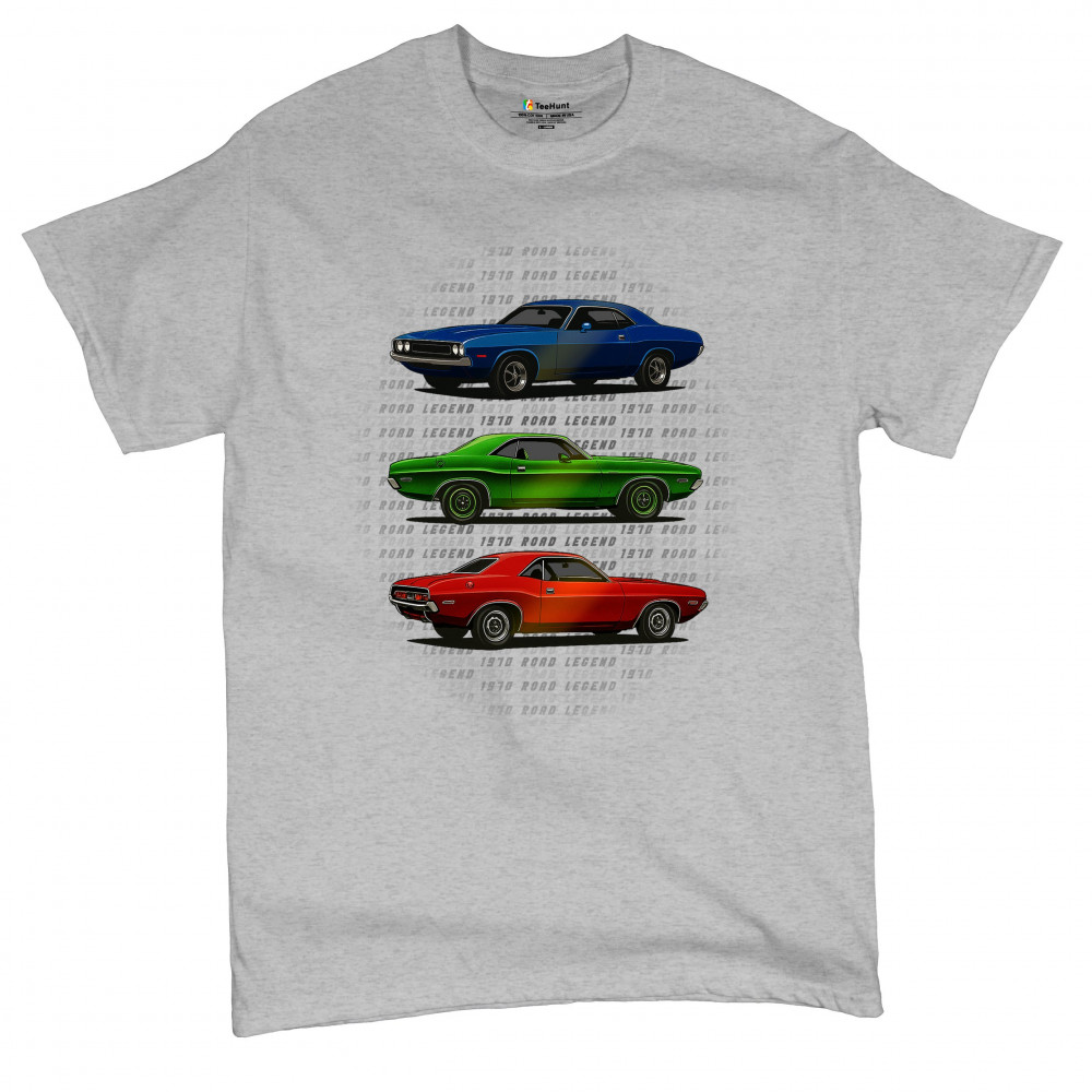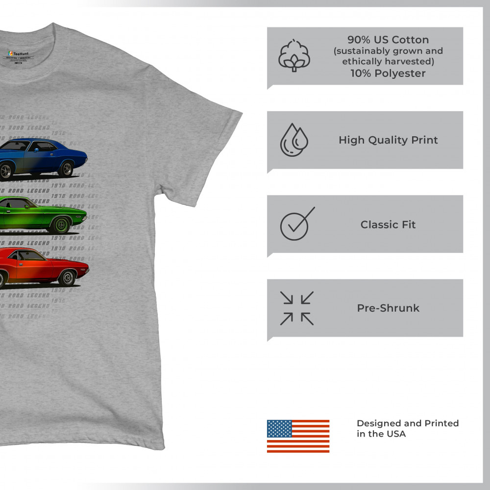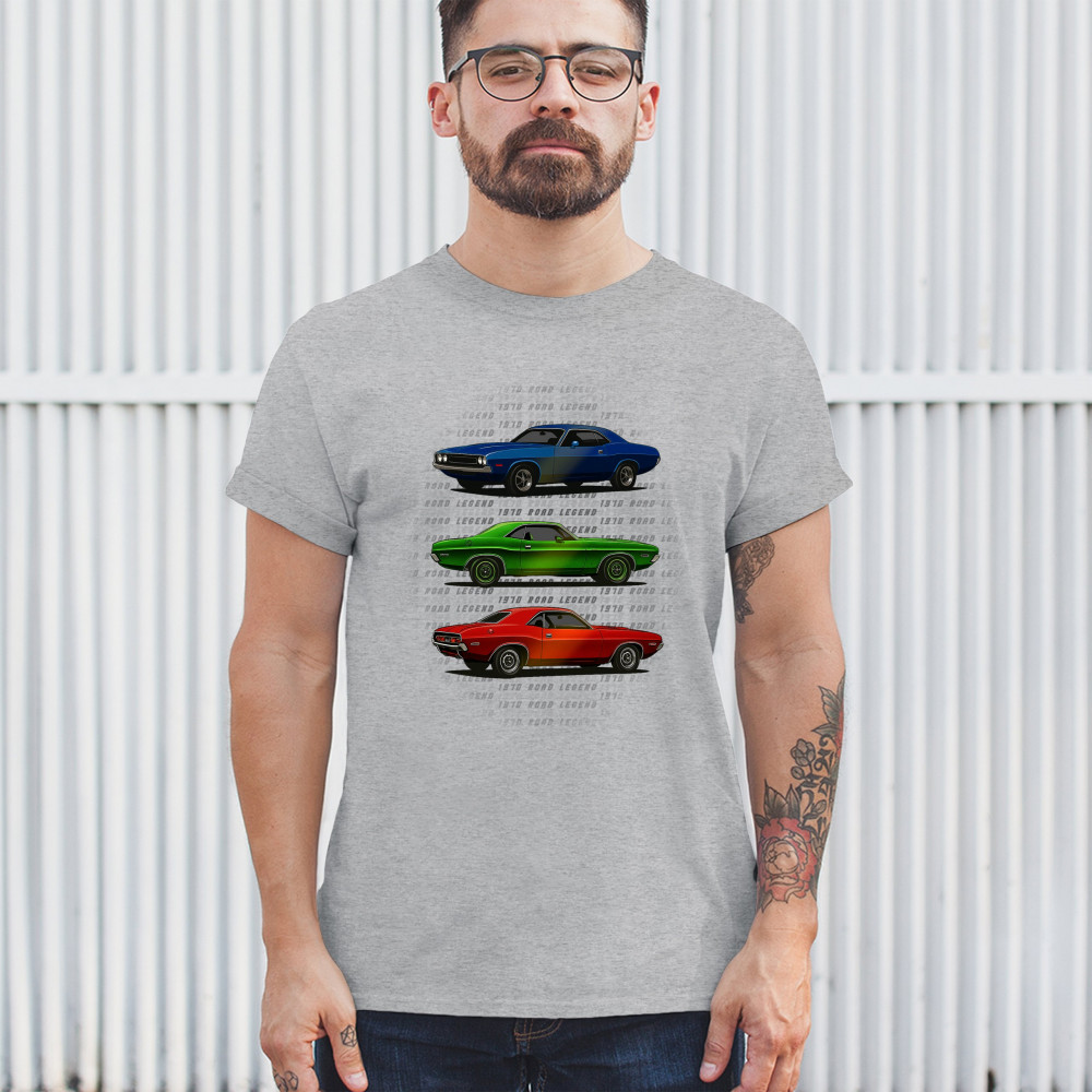 Three bold 1970 muscle cars, stacked in red, green, and blue, celebrate vintage power and road legend status. This retro-inspired design captures the essence of American car culture—made for gearheads, V8 fans, and anyone who lives for classic performance, heritage, and style.