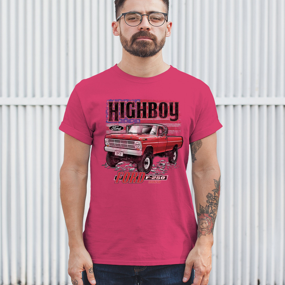 This vintage truck design features a 1971 Ford F-250 Highboy 4x4 with a classic lifted stance and patriotic flag background. Bold and nostalgic, it’s perfect for classic truck fans, 4x4 lovers, off-roaders, and collectors who appreciate American V8 tradition. Show it off at truck shows, meets, or cruise nights.