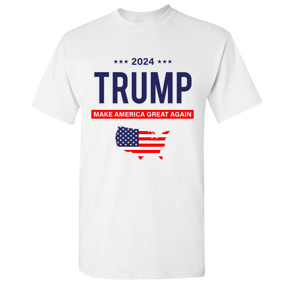 A political print saying "2024 Trump Make America Great Again" and features the silhouette of the USA with the American flag inside of it. A great choice to wear for a Trump rally or give as a gift to a Donald Trump supporter before 2024 presidential elec
