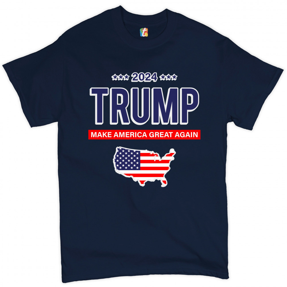 A political print saying "2024 Trump Make America Great Again" and features the silhouette of the USA with the American flag inside of it. A great choice to wear for a Trump rally or give as a gift to a Donald Trump supporter before 2024 presidential elec