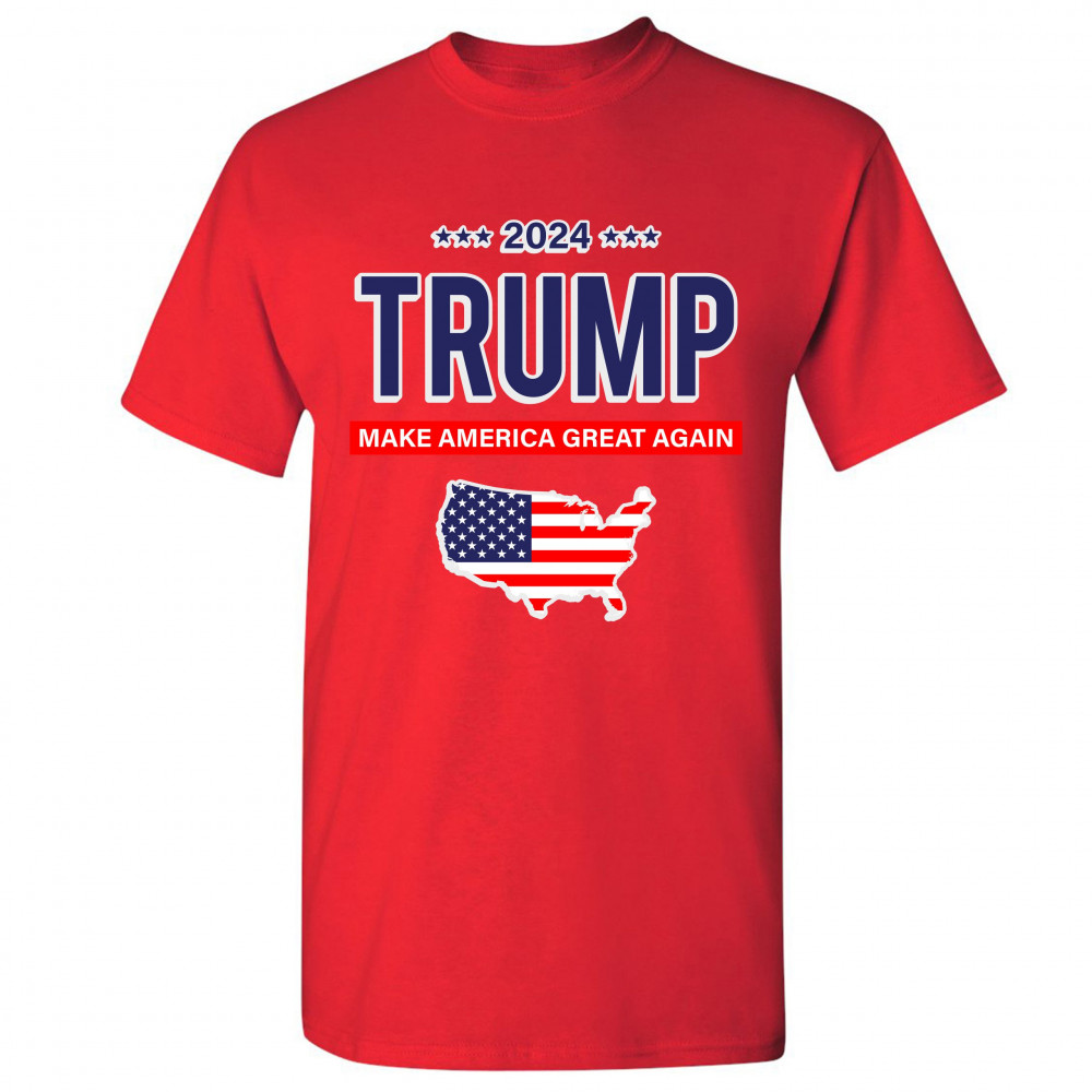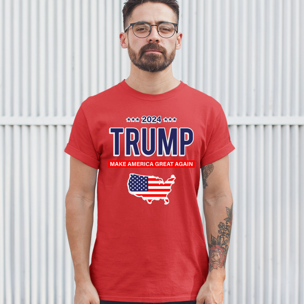 A political print saying "2024 Trump Make America Great Again" and features the silhouette of the USA with the American flag inside of it. A great choice to wear for a Trump rally or give as a gift to a Donald Trump supporter before 2024 presidential elec