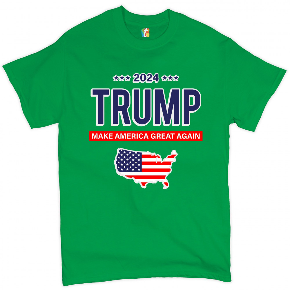 A political print saying "2024 Trump Make America Great Again" and features the silhouette of the USA with the American flag inside of it. A great choice to wear for a Trump rally or give as a gift to a Donald Trump supporter before 2024 presidential elec