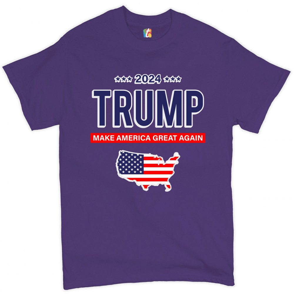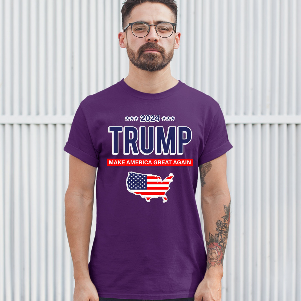 A political print saying "2024 Trump Make America Great Again" and features the silhouette of the USA with the American flag inside of it. A great choice to wear for a Trump rally or give as a gift to a Donald Trump supporter before 2024 presidential elec