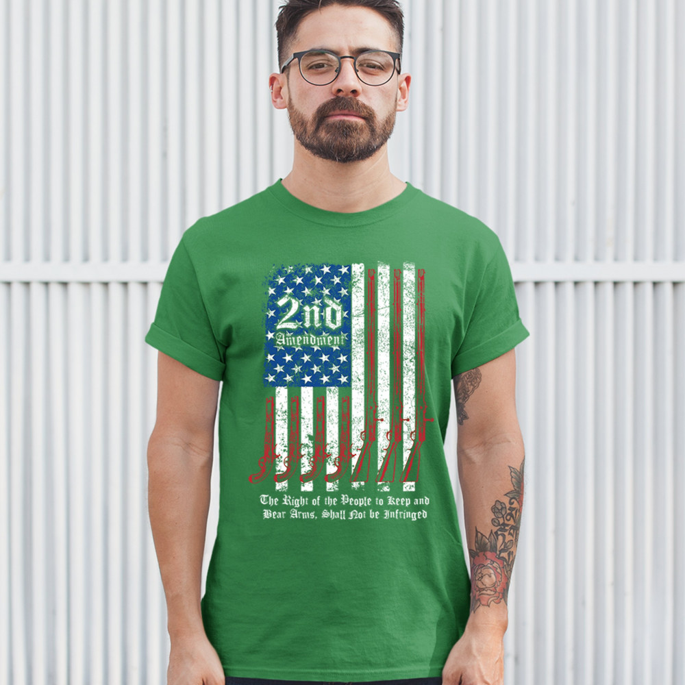 A print featuring a distressed American flag with pistols and muskets instead of red stripes. Atop of the 50 stars "2nd Amendment" is written. The print says: "The Right of the People to Keep and Bear Arms, Shall Not be Infringed ". Great choice for any g