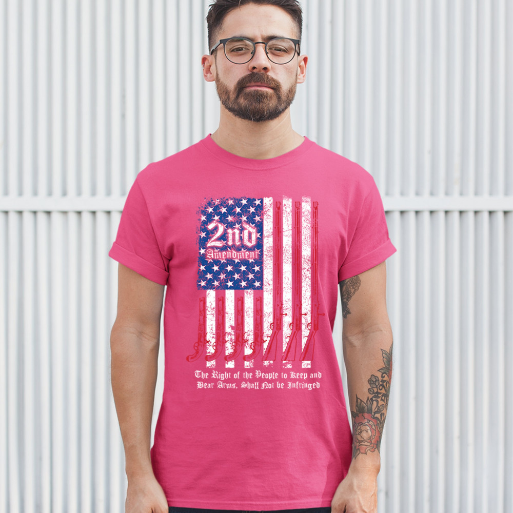 A print featuring a distressed American flag with pistols and muskets instead of red stripes. Atop of the 50 stars "2nd Amendment" is written. The print says: "The Right of the People to Keep and Bear Arms, Shall Not be Infringed ". Great choice for any g