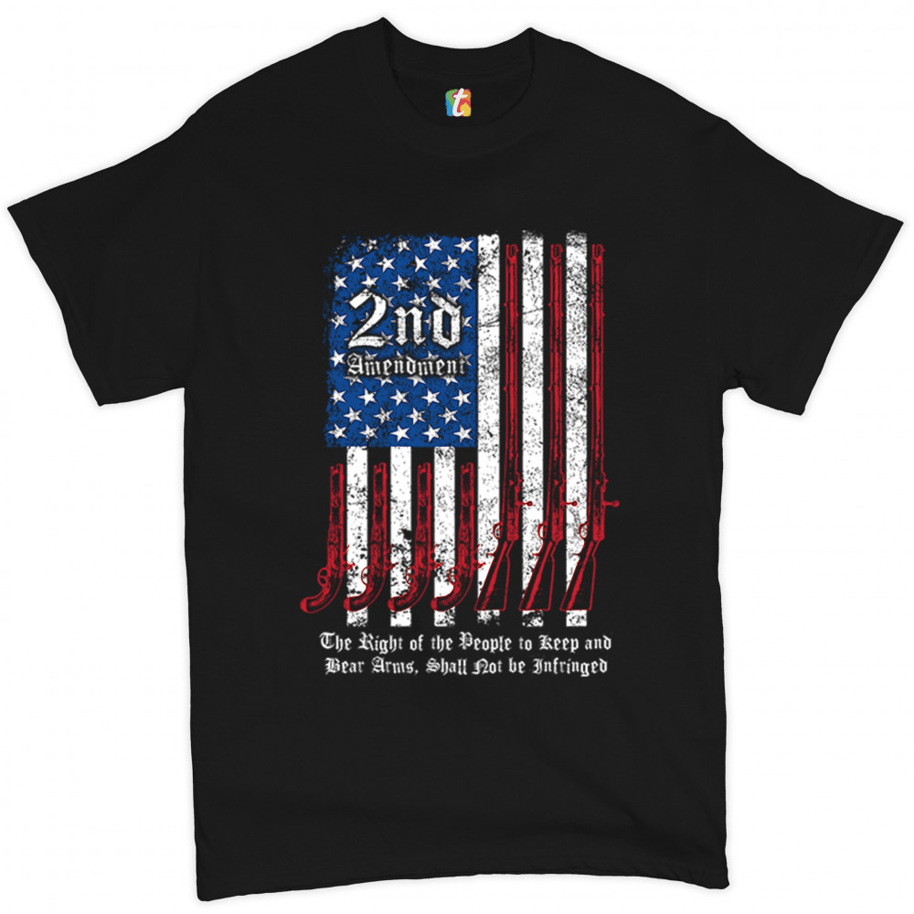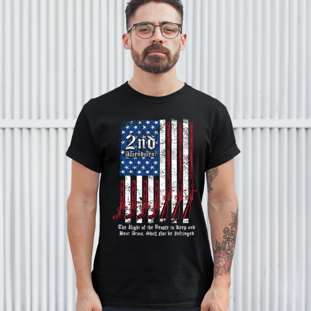 A print featuring a distressed American flag with pistols and muskets instead of red stripes. Atop of the 50 stars "2nd Amendment" is written. The print says: "The Right of the People to Keep and Bear Arms, Shall Not be Infringed ". Great choice for any g
