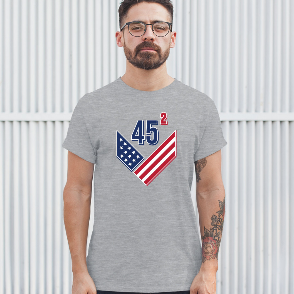 A political print featuring a number 45 squared and two lines with stars and stripes on them. A great choice to wear for a Trump rally or give as a gift to a Donald Trump and Mike Pence supporter before 2020 presidential elections.