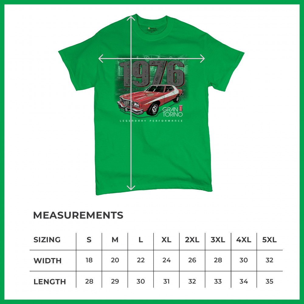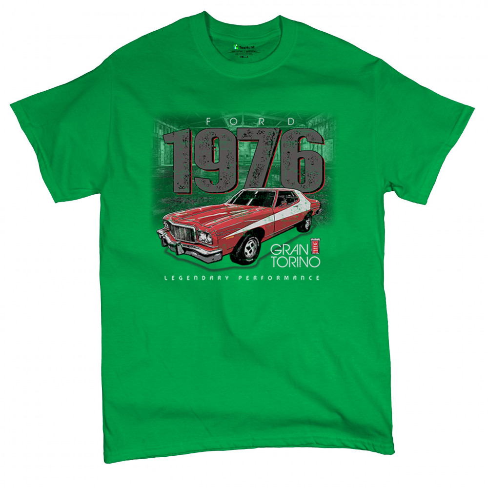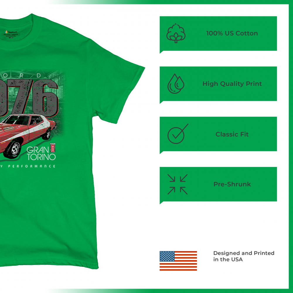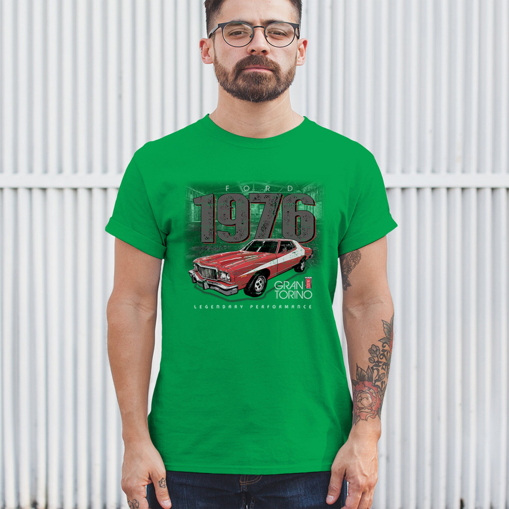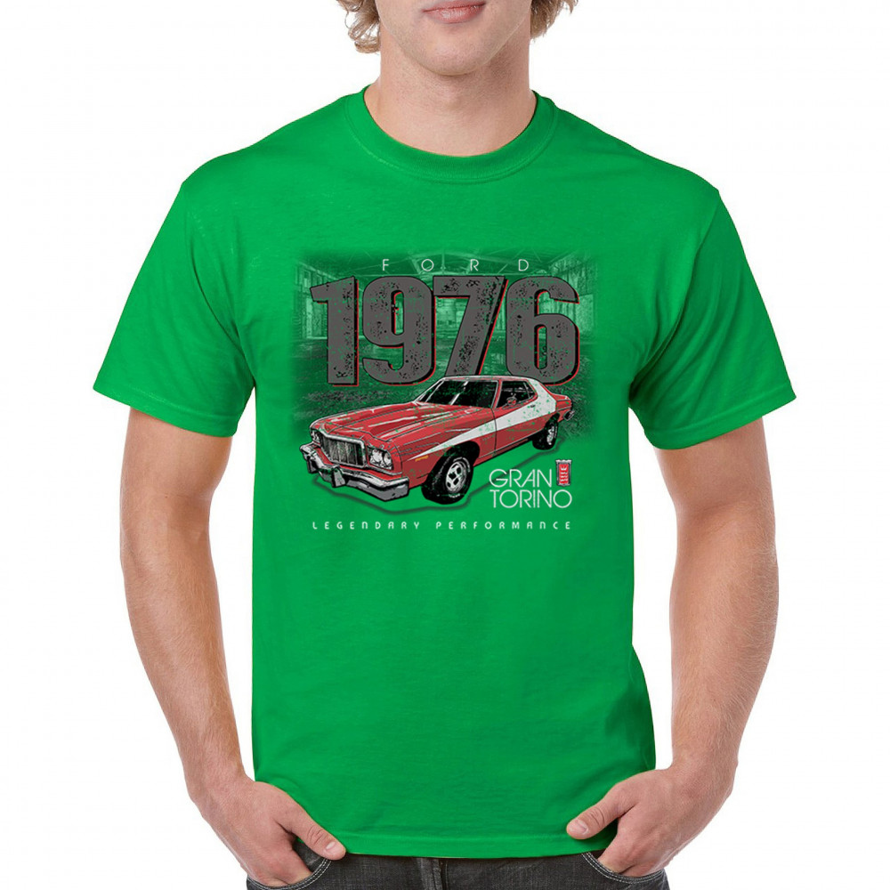1976 Ford Gran Torino design with red and white retro style. Perfect for muscle car fans, Ford lovers, and classic car event gear.