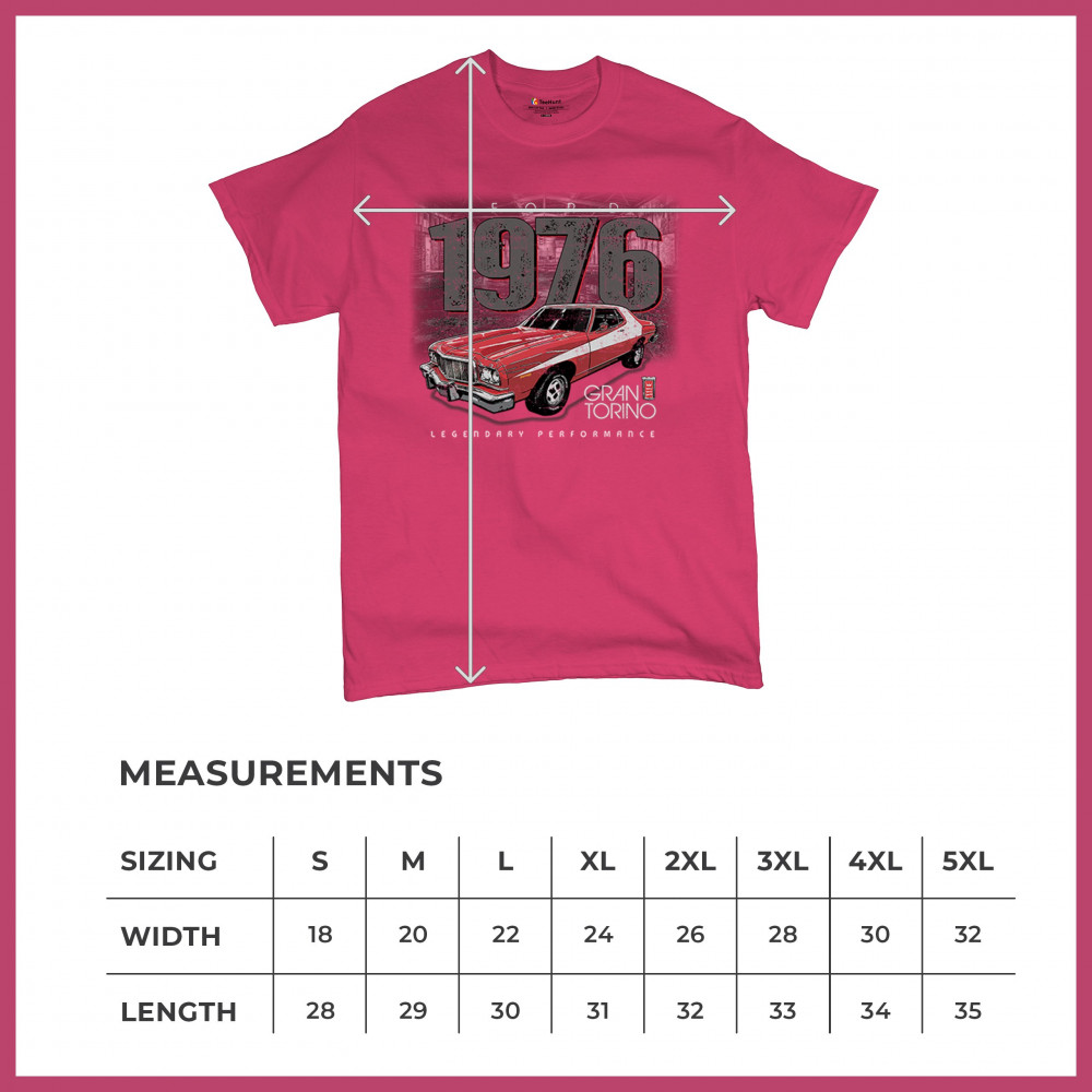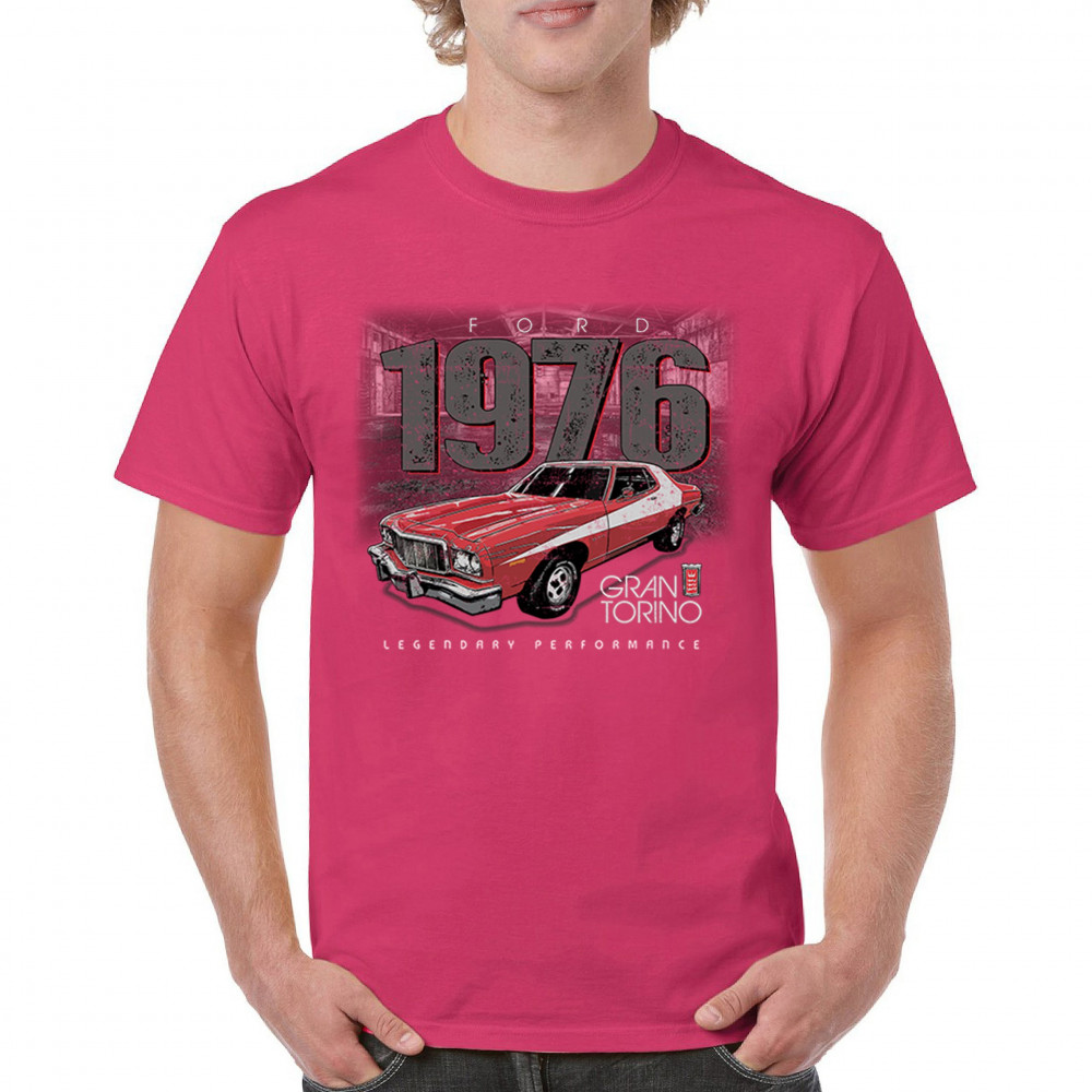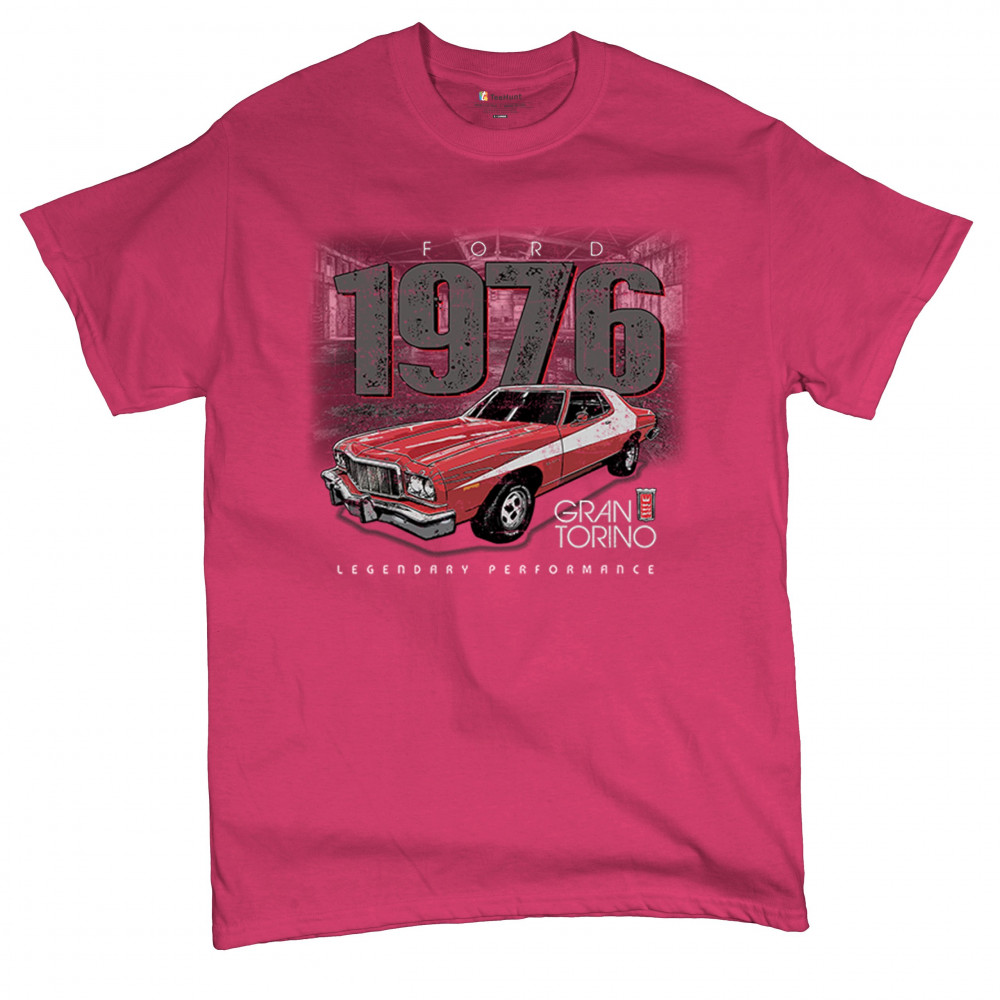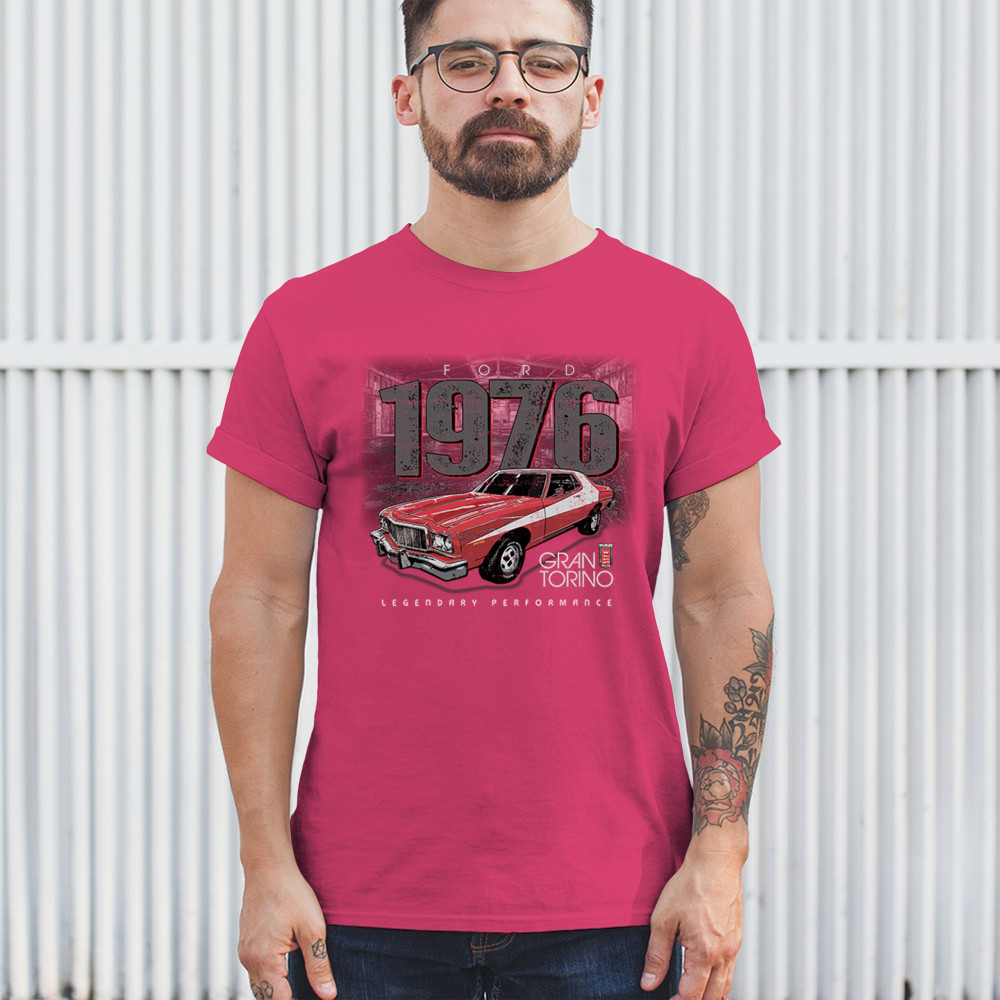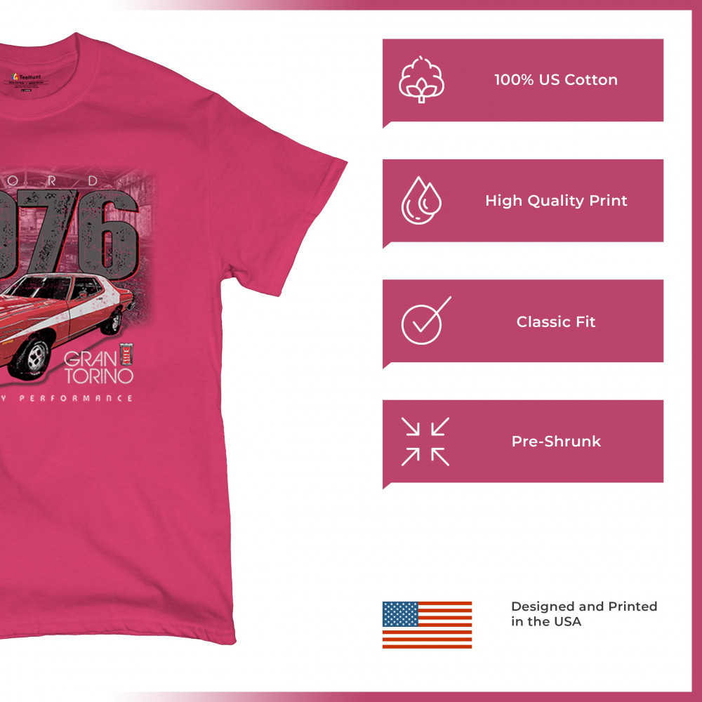 1976 Ford Gran Torino design with red and white retro style. Perfect for muscle car fans, Ford lovers, and classic car event gear.