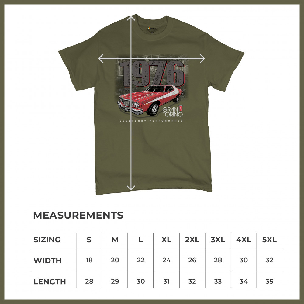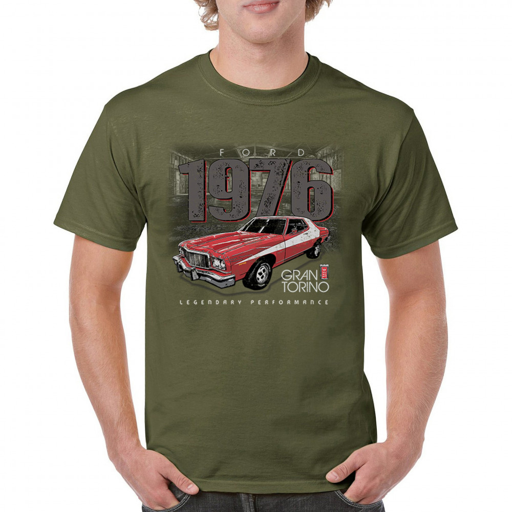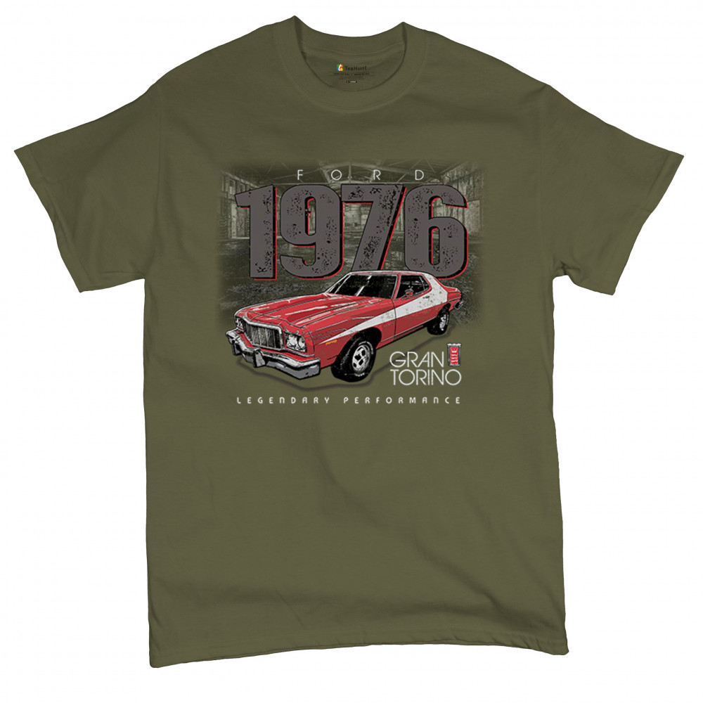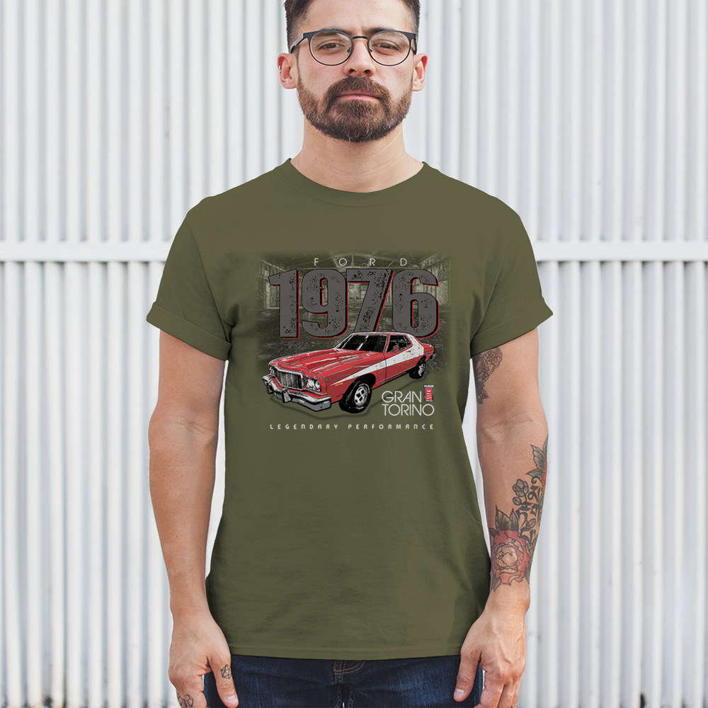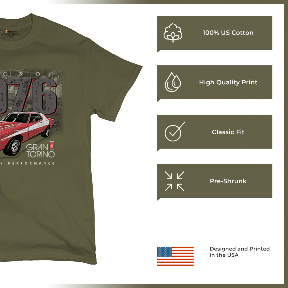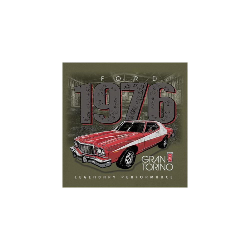 1976 Ford Gran Torino design with red and white retro style. Perfect for muscle car fans, Ford lovers, and classic car event gear.