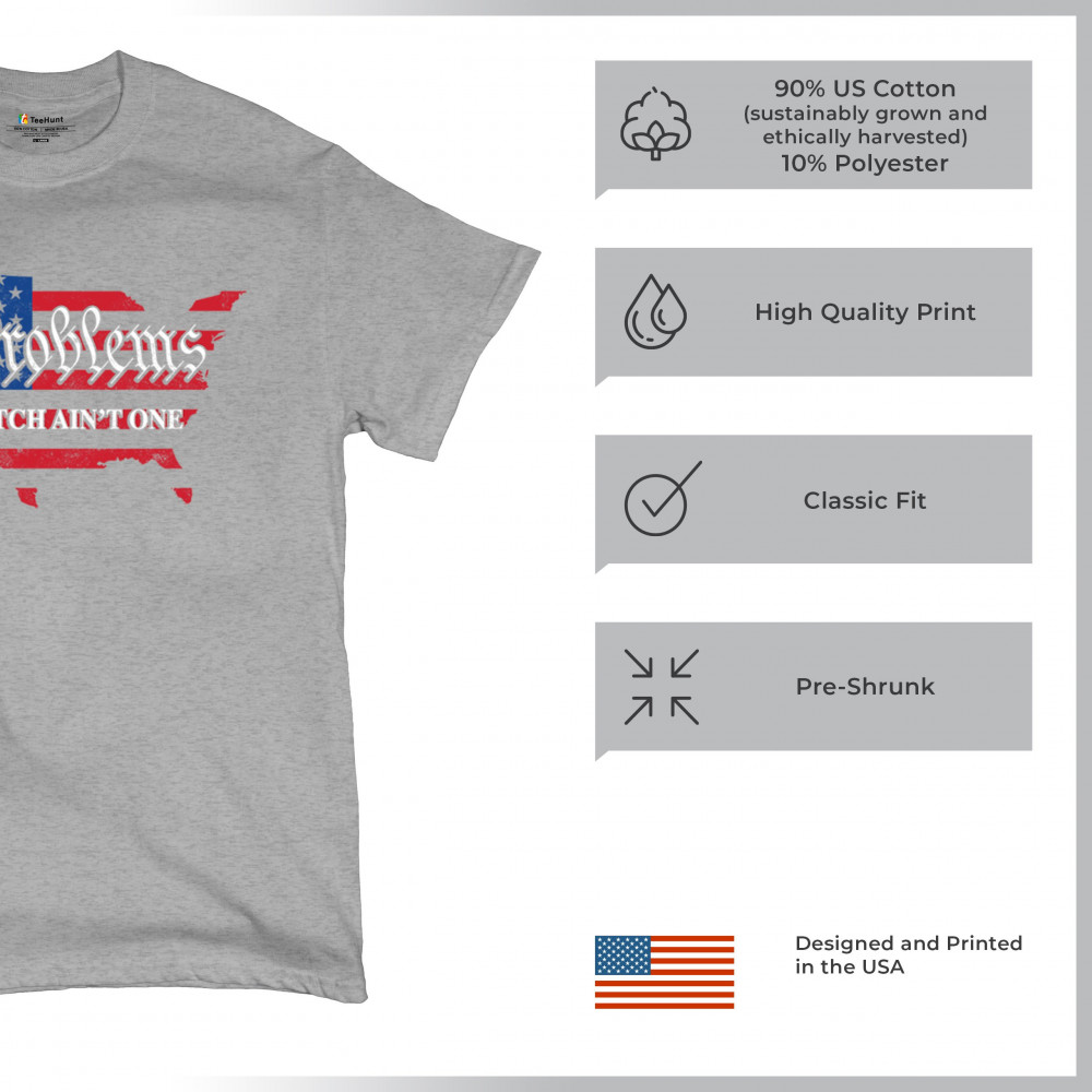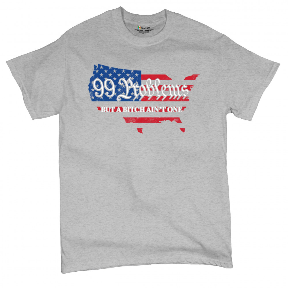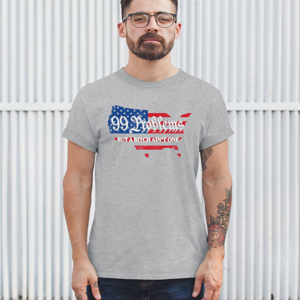 Embrace your patriotic spirit with this striking "99 Problems But a B*tch Ain't One" design, blending the American map and flag-inspired elements. Perfect for Trump supporters, conservatives, and all who believe in the values of freedom, victory, and the Republican Red Wave. Celebrate your commitment to America and make a statement that reflects your unwavering belief in the people's mandate and the party of common sense.