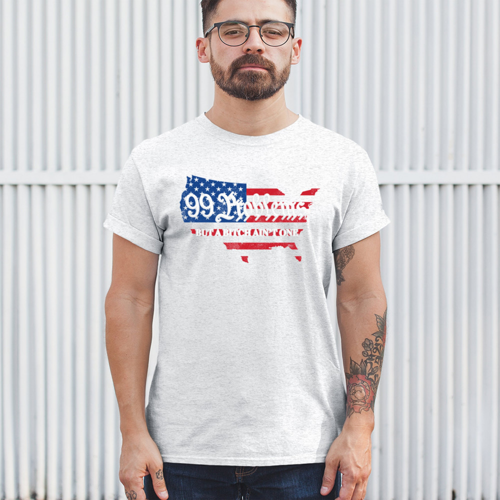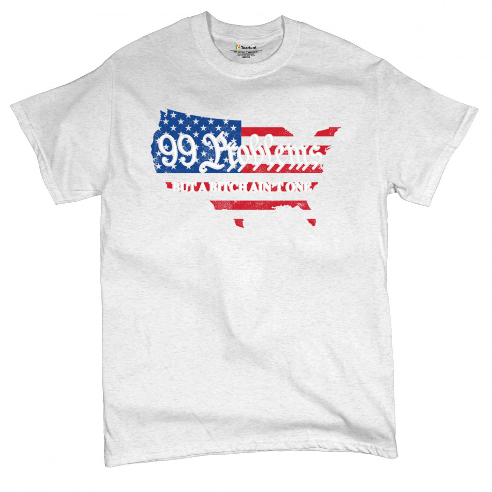 Embrace your patriotic spirit with this striking "99 Problems But a B*tch Ain't One" design, blending the American map and flag-inspired elements. Perfect for Trump supporters, conservatives, and all who believe in the values of freedom, victory, and the Republican Red Wave. Celebrate your commitment to America and make a statement that reflects your unwavering belief in the people's mandate and the party of common sense.