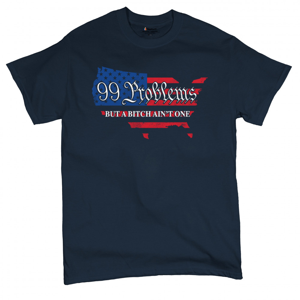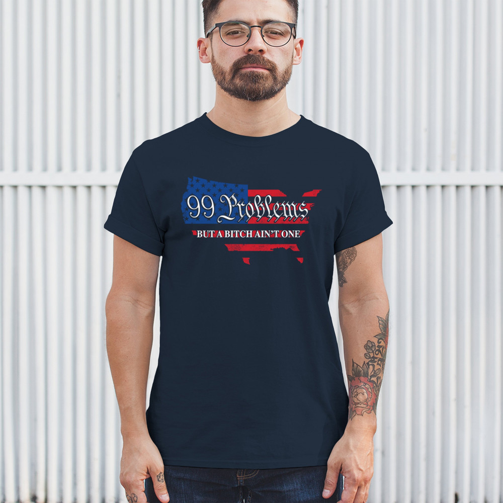 Embrace your patriotic spirit with this striking "99 Problems But a B*tch Ain't One" design, blending the American map and flag-inspired elements. Perfect for Trump supporters, conservatives, and all who believe in the values of freedom, victory, and the Republican Red Wave. Celebrate your commitment to America and make a statement that reflects your unwavering belief in the people's mandate and the party of common sense.