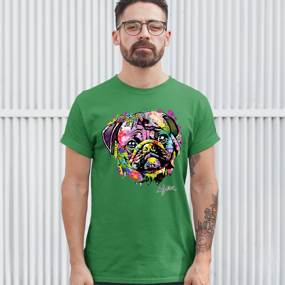 A beautiful print featuring a colorful face of an adorable pug. Below the dog the name of the artist - Andy Maxx - is included. A great choice for a person who is in love with these adorable and gentle dogs.