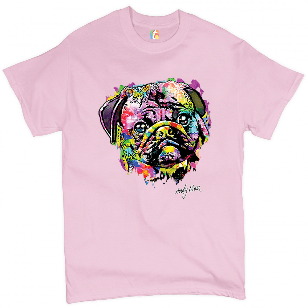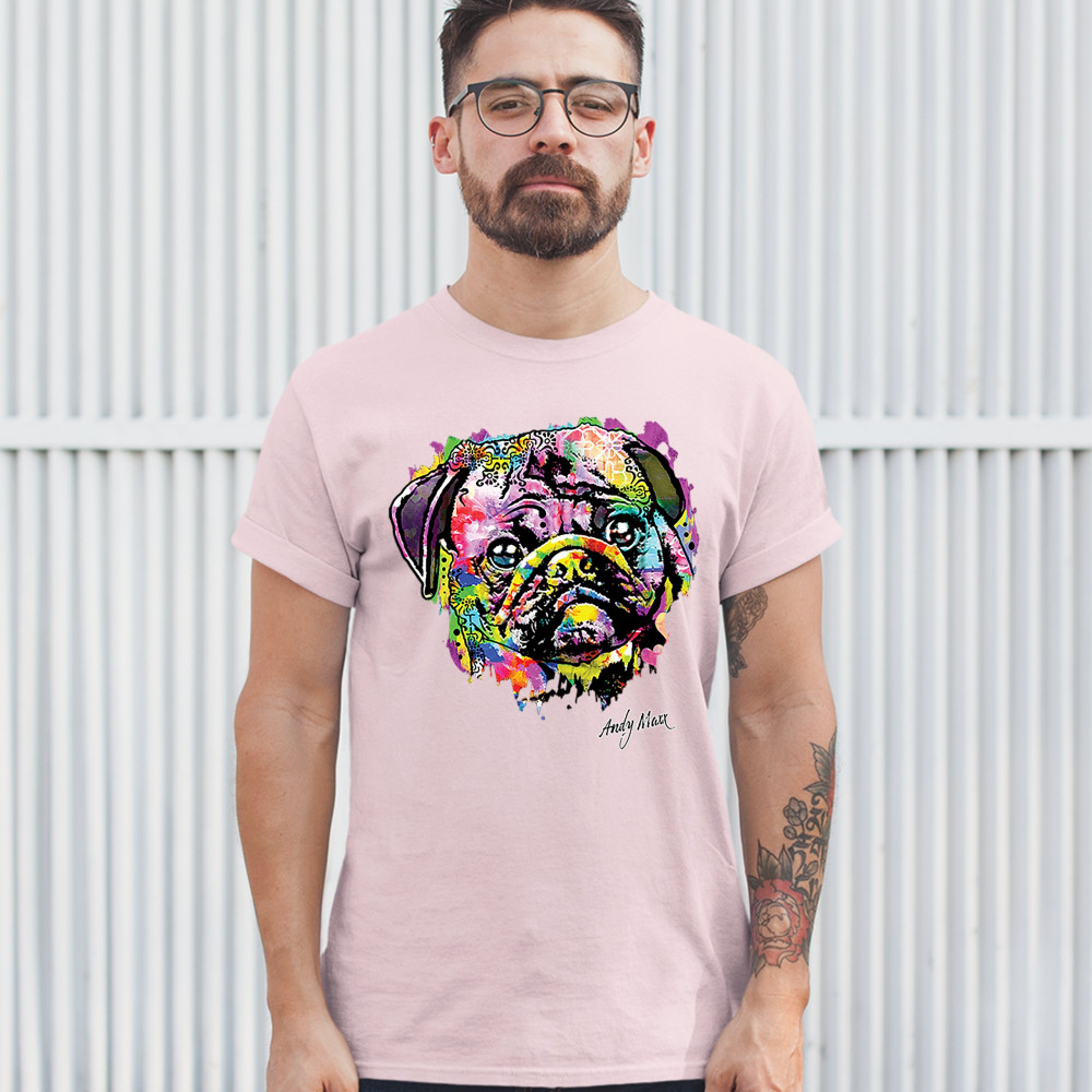 A beautiful print featuring a colorful face of an adorable pug. Below the dog the name of the artist - Andy Maxx - is included. A great choice for a person who is in love with these adorable and gentle dogs.