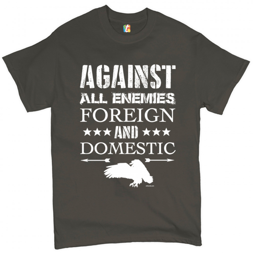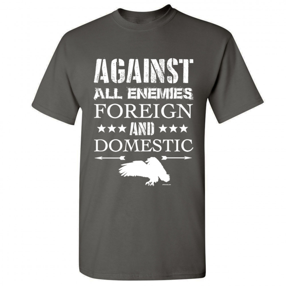 A patriotic print saying "Against All Enemies Foreign and Domestic" and featuring a silhouette of an eagle. Great choice to wear on Independence Day or any other patriotic holiday.