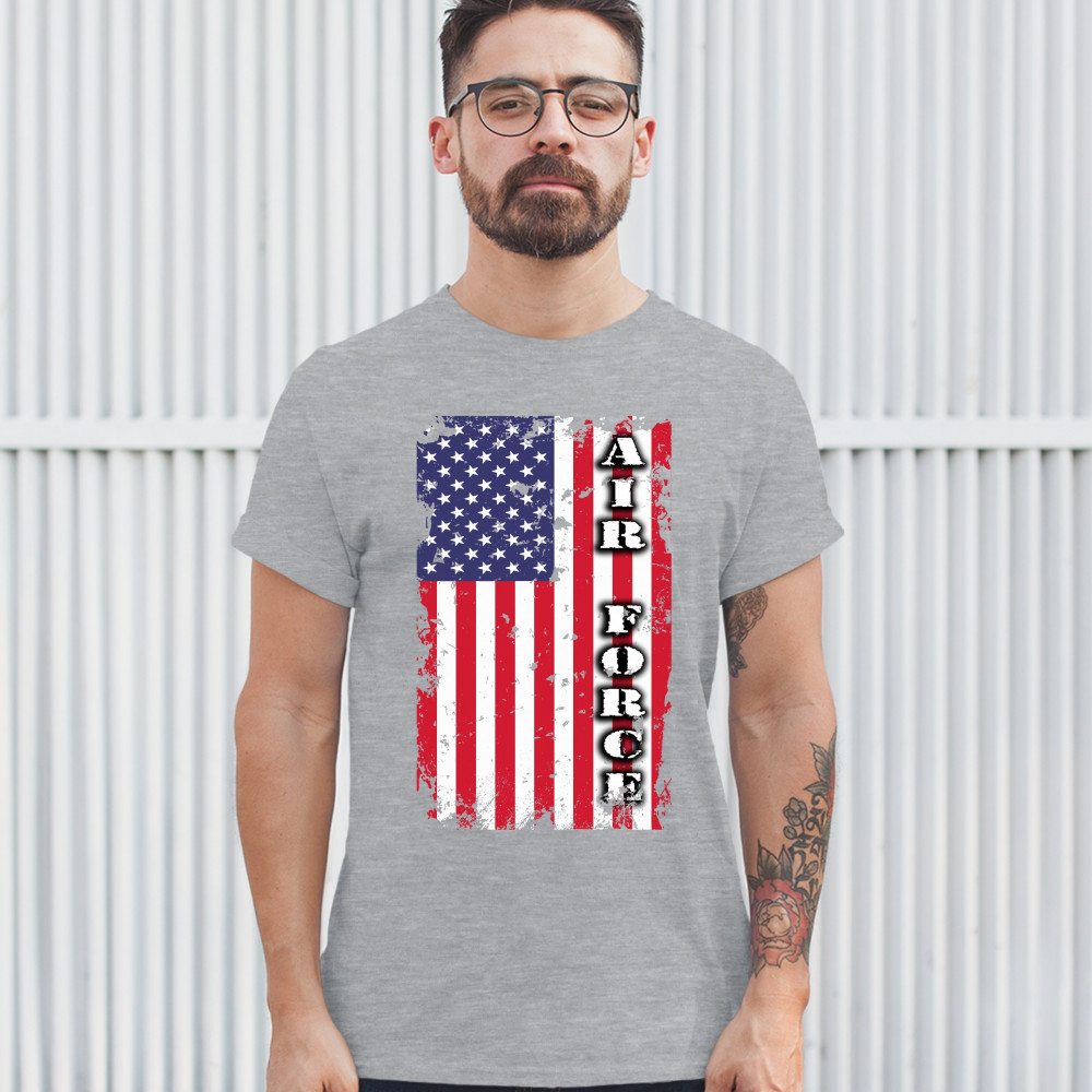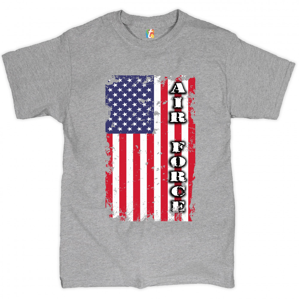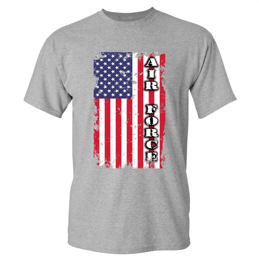A patriotic print featuring a distressed American flag with "Air Force" written over it. Great choice to wear on Independence Day or any other patriotic holiday.