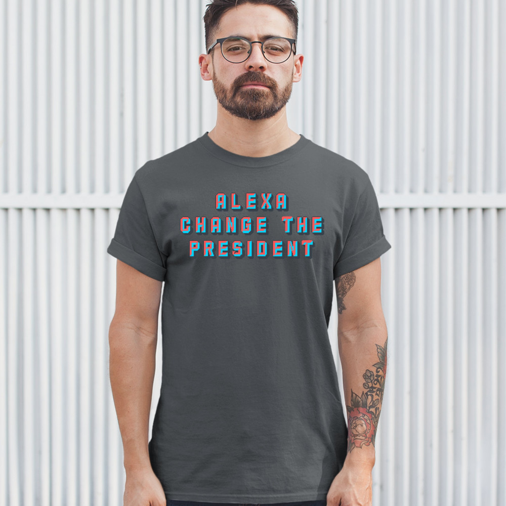 A print saying "Alexa Change the President". A great choice to wear to a Trump rally or give as a gift to a Donald Trump supporter before 2024 presidential elections.