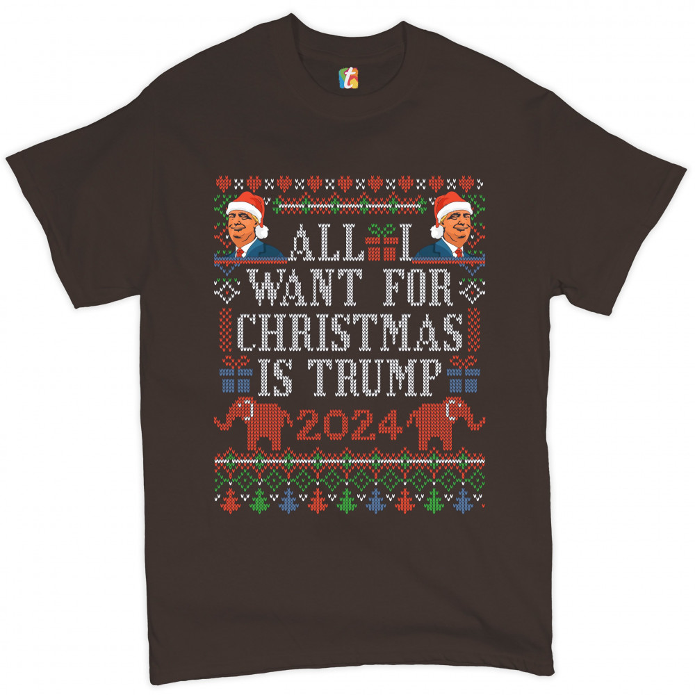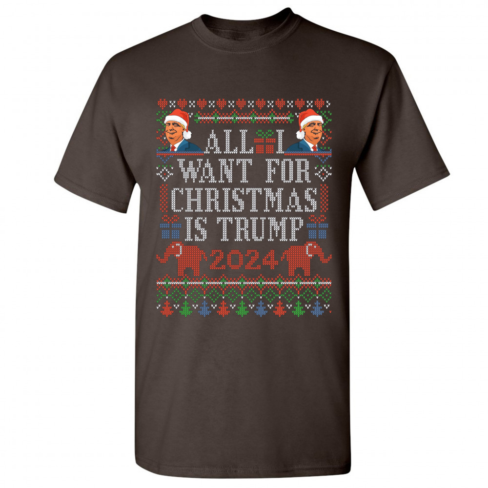 A funny print saying: "All I Want for Christmas Is Trump 2024". The print is decorated as a Christmas ugly sweater and features faces of Donald Trump wearing Christmas hats and two elephants. A great choice to wear for a Christmas or New Year's Eve party
