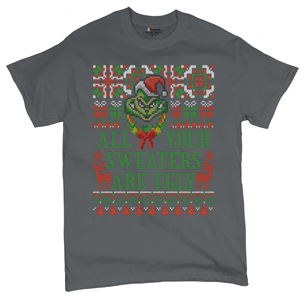 A funny print saying: "All Your Sweaters Are Ugly" and featuring a green goblin's face and two reindeers. The print is decorated as an ugly sweater. Amazing choice to make people smile and spread positive vibes on Christmas Eve.