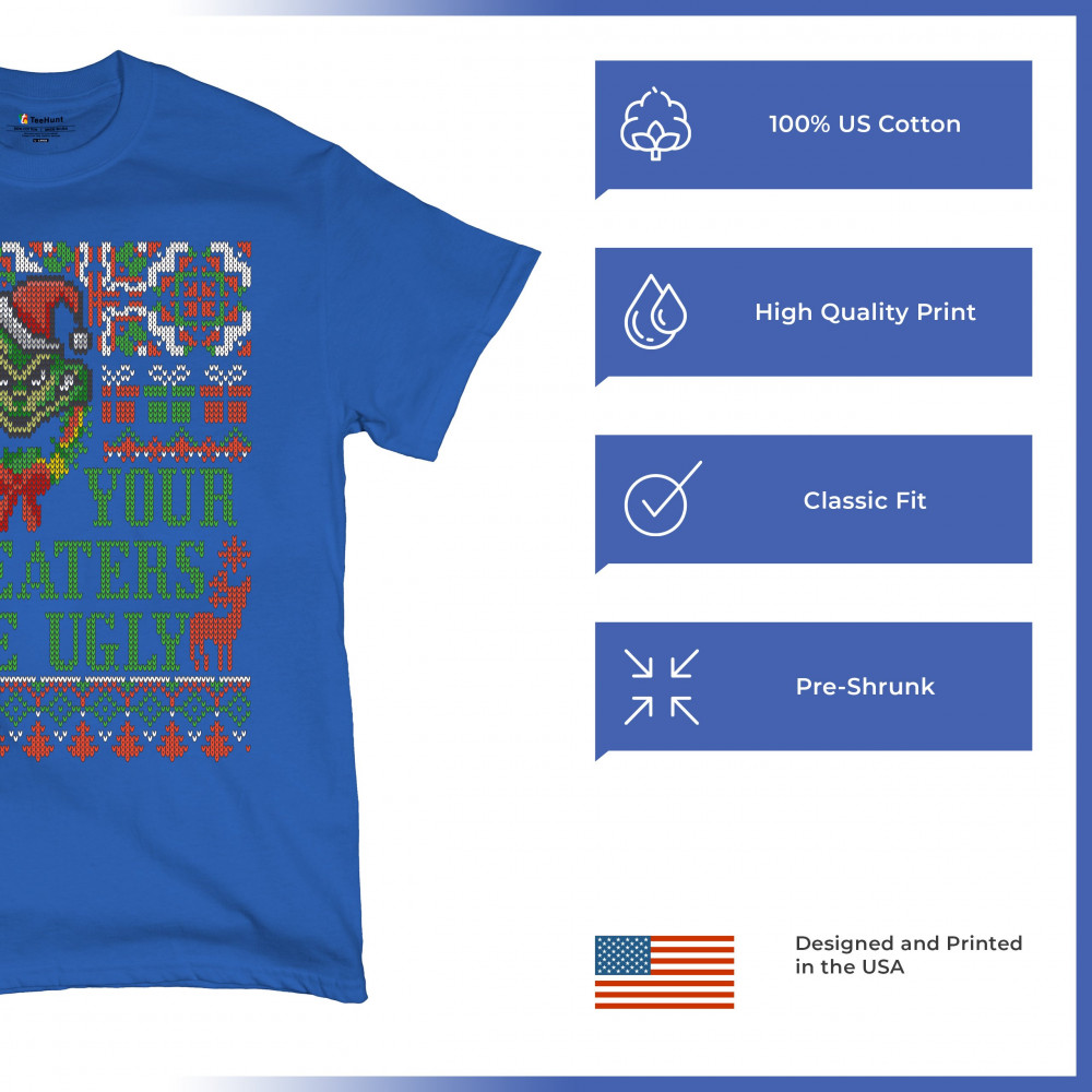 A funny print saying: "All Your Sweaters Are Ugly" and featuring a green goblin's face and two reindeers. The print is decorated as an ugly sweater. Amazing choice to make people smile and spread positive vibes on Christmas Eve.