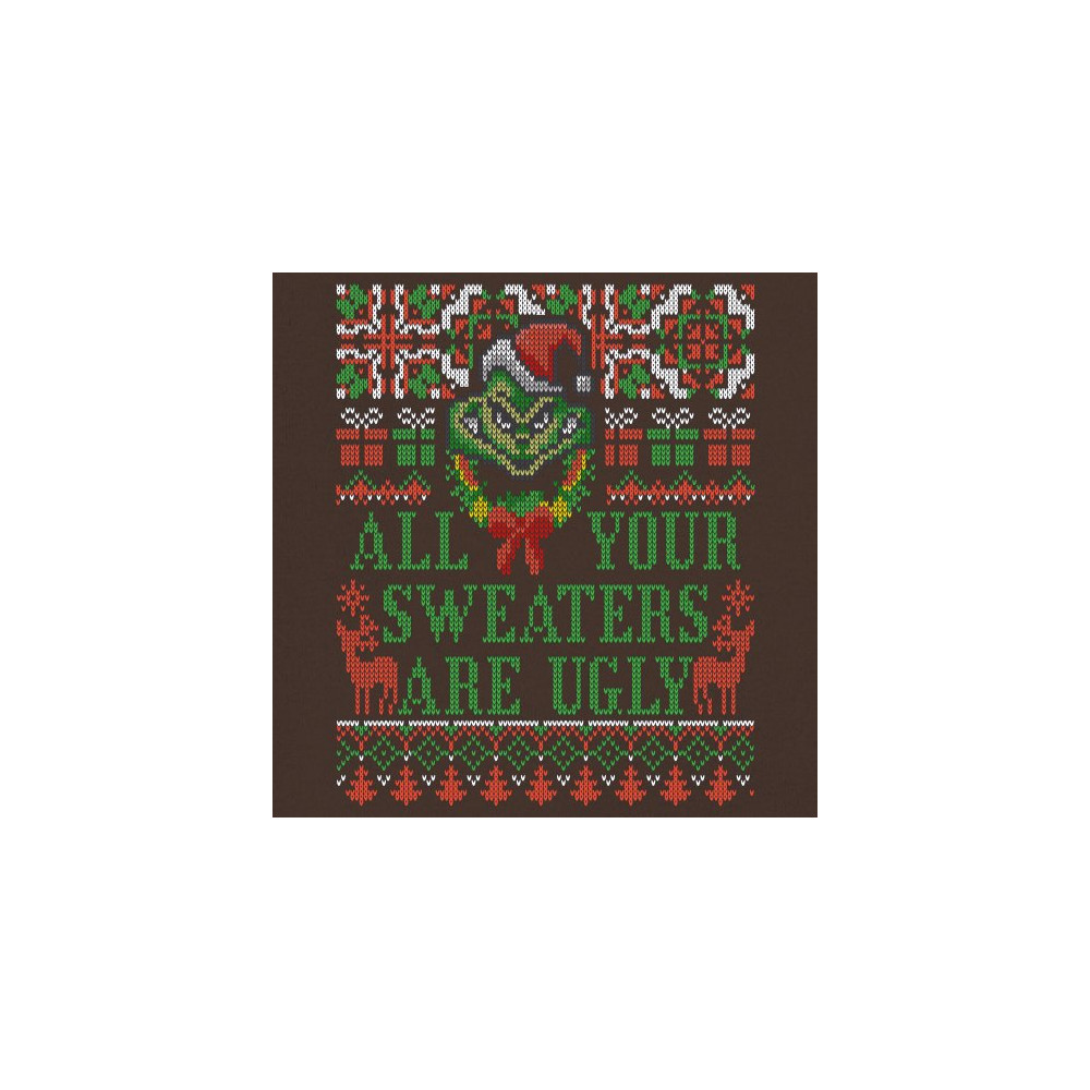 A funny print saying: "All Your Sweaters Are Ugly" and featuring a green goblin's face and two reindeers. The print is decorated as an ugly sweater. Amazing choice to make people smile and spread positive vibes on Christmas Eve.