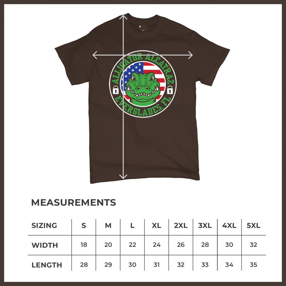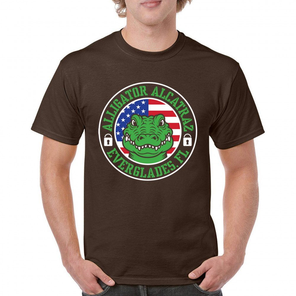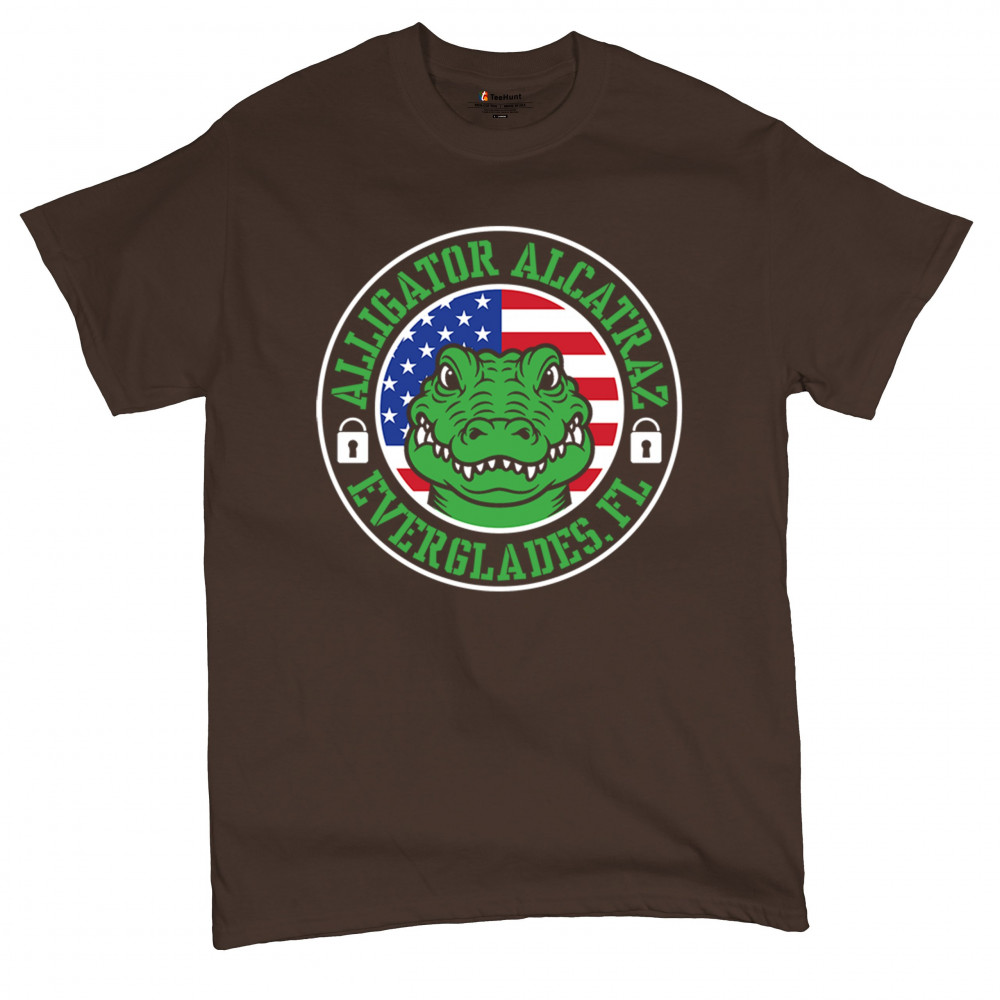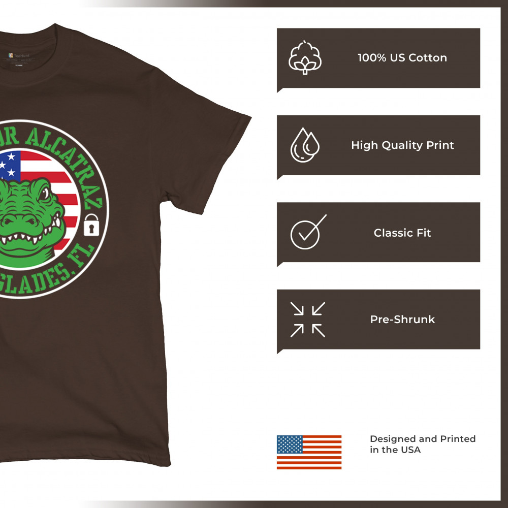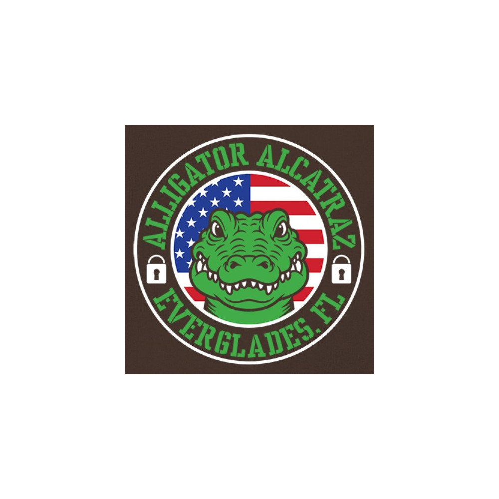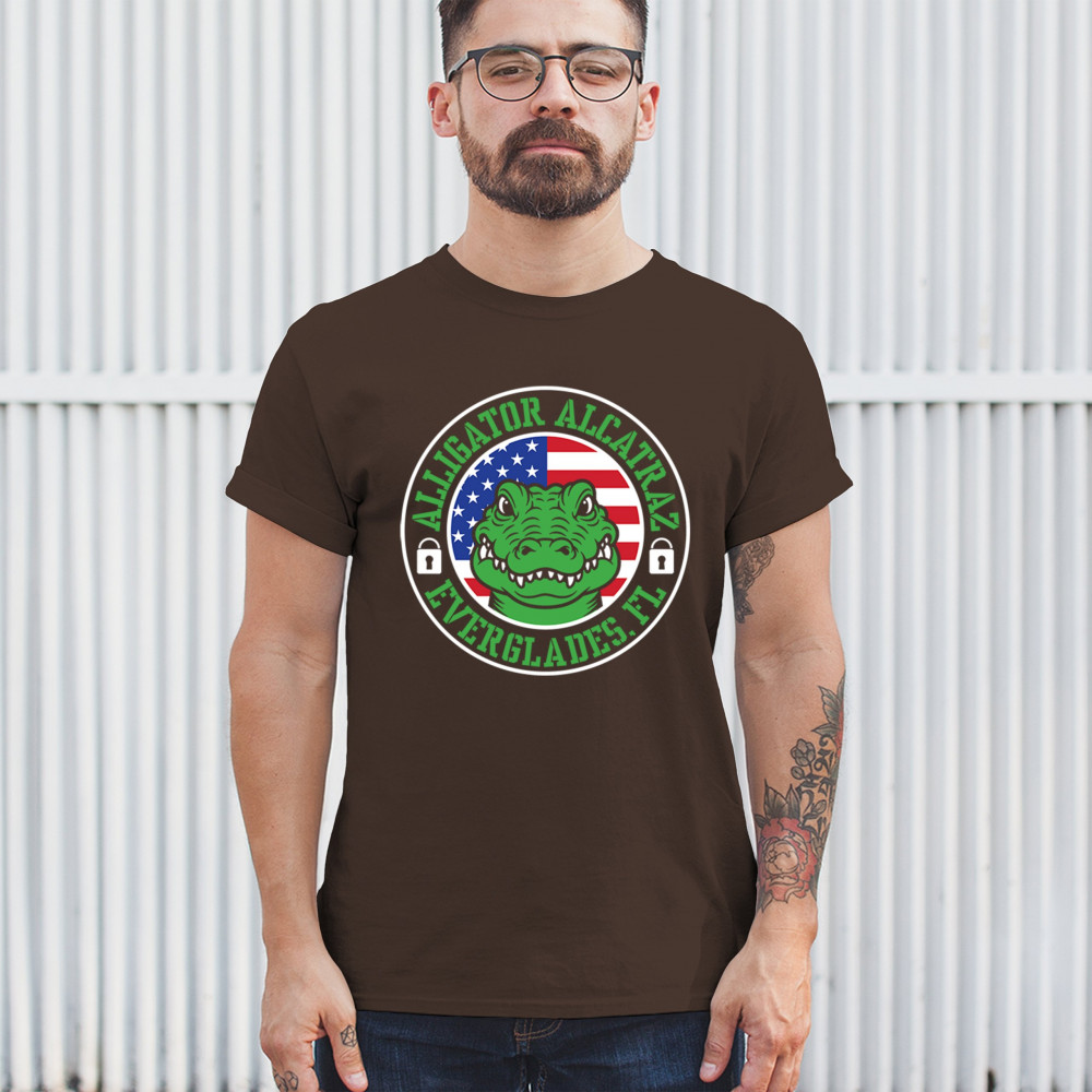 Bold Alligator Alcatraz design with USA flag and conservative message. Patriotic, America First, and proud to take a stand for national values.