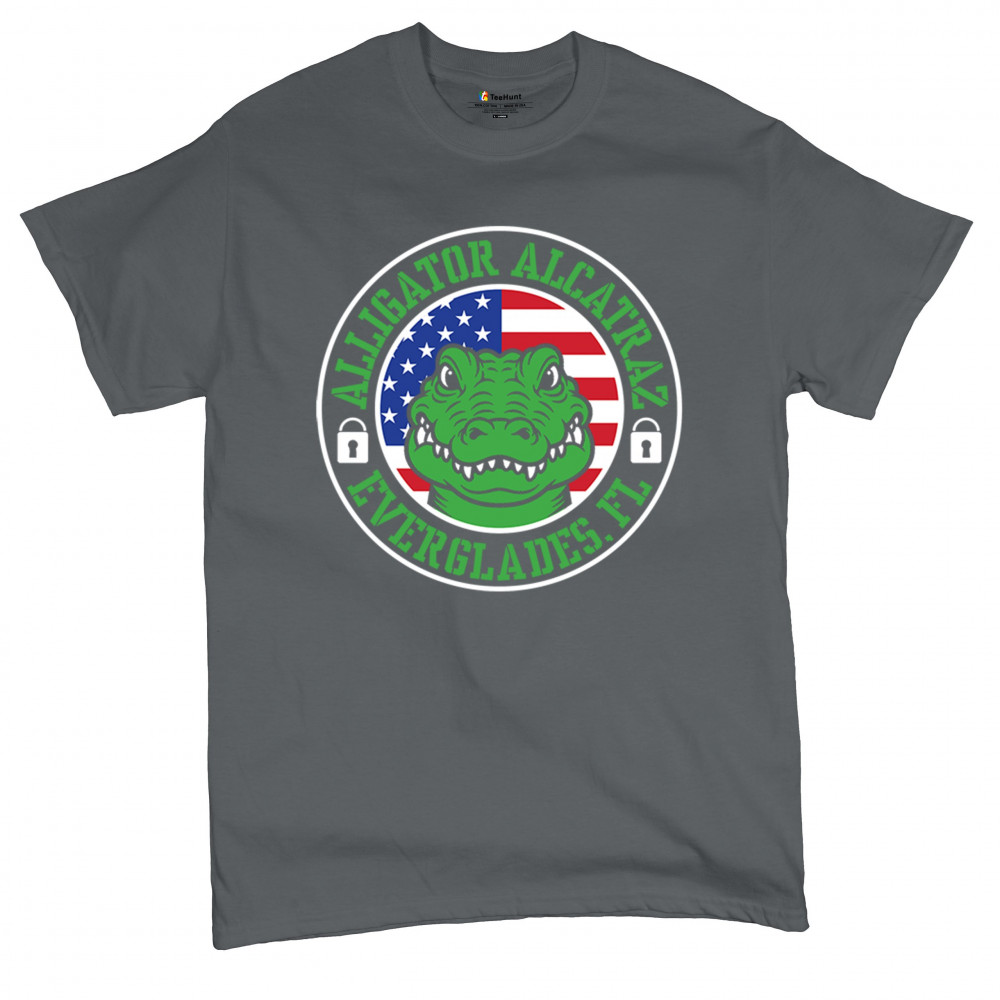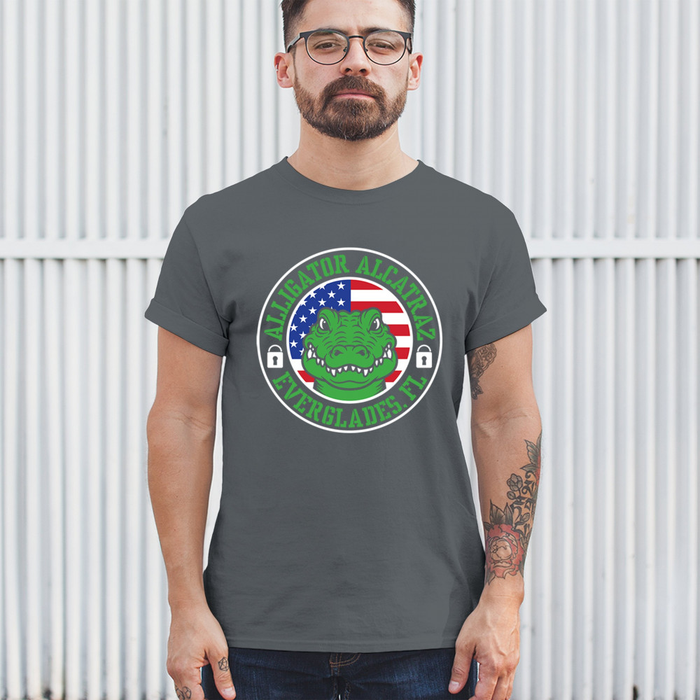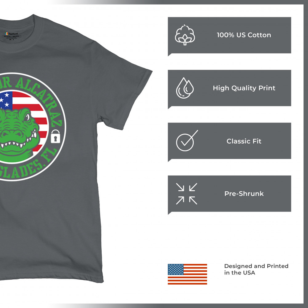 Stand tall in your values with this Alligator Alcatraz Everglades design. A fierce mash-up of patriotic graphics and political edge—perfect for conservative voices, USA pride supporters, and America First believers. Lock in your statement with this bold, affordable everyday style.