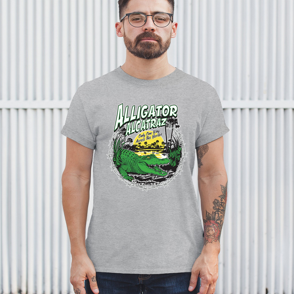 Alligator Alcatraz design with border security message. For conservative, Republican, and patriotic Americans who stand for America First values.